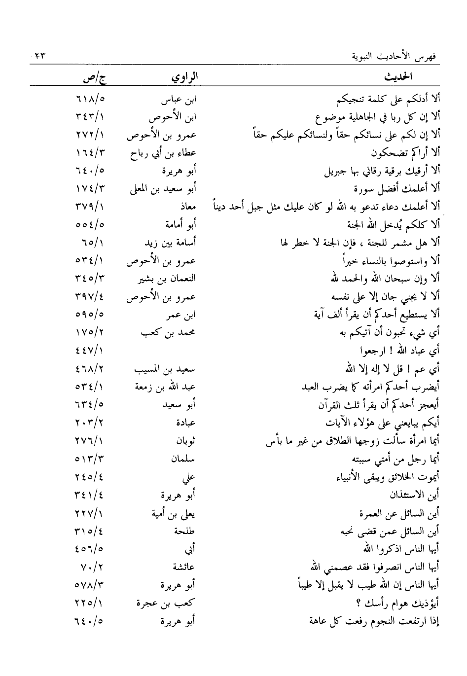 ألا أدلكم على كلمة تنجيكم: ابن عباس: 5/ 618 أَلَا إِنَّ كُلَّ رِبًا فِي الْجَاهِلِيَّةِ مَوْضُوعٌ: ابن الأحوص: 1/ 343 أَلَا إِنَّ لَكُمْ عَلَى نِسَائِكُمْ حَقًّا وَلِنِسَائِكُمْ عليكم حقا: عمرو بن الأحوص: 1/ 272 ألا أراكم تضحكون: عطاء بن أبي رباح: 3/ 164 ألا أرقيك برقية