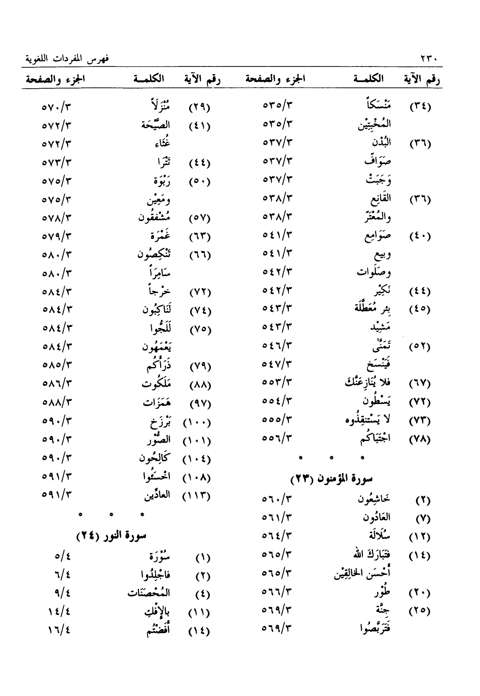 (2) : خاشعون: 3/ 560 (7) : العادون: 3/ 561 (12) : سلالة: 3/ 564 (14) : فتبارك الله: 3/ 565: أحسن الخالقين: 3/ 565 (20) : طور: 3/ 566 (25) : جنّة: 3/ 569: فتربّصوا: 3/ 569 (29) : منزلا: 3/ 570 (41) : الصّيحة: 3/ 572: غثاء: 3/ 572 (44) : تترا: 3/ 573 (50) : ربوة: 3/ 575: ومعين: 3/ 575 (57) : مشفقون: 3/ 578 (63) : غمرة: 3/ 579 (66) : تنكصون: 3/ 580: سامرا: 3/ 580 (72) : خرجا: 3/ 584 (74) : لناكبون: 3/ 584 (75) : للجّوا: 3/ 584: يعمهون: 3/ 584 (79) : ذرأكم: 3/ 585 (88) : ملكوت: 3/ 586 (97) : همزات: 3/ 588 (100) : برزخ: 3/ 590 (101) : الصّور: 3/ 590 (104) : كالحون: 3/ 590 (108) : اخسئوا: 3/ 591 (113) : العادّين: 3/ 591