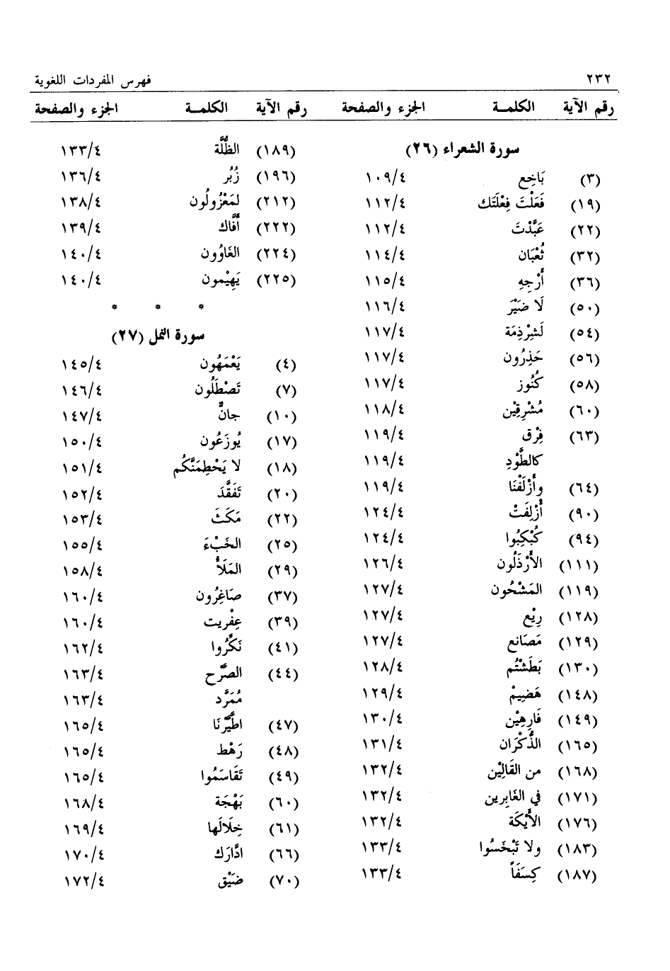 (3) : باخع: 4/ 109 (19) : فعلت فعلتك: 4/ 112 (22) : عبّدت: 4/ 112 (32) : ثعبان: 4/ 114 (36) : أرجه: 4/ 115 (50) : لا ضير: 4/ 116 (54) : لشرذمة: 4/ 117 (56) : حذرون: 4/ 117 (58) : كنوز: 4/ 117 (60) : مشرقين: 4/ 118 (63) : فرق: 4/ 119: كالطّود: 4/ 119 (64) : وأزلفنا: 4/ 119 (90) : أزلفت: 4/ 124 (94) : كبكبوا: 4/ 124 (111) : الأرذلون: 4/ 126 (119) : المشحون: 4/ 127 (128) : ريع: 4/ 127 (129) : مصانع: 4/ 127 (130) : بطشتم: 4/ 128 (148) : هضيم: 4/ 129 (149) : فارهين: 4/ 130 (165) : الذّكران: 4/ 131 (168) : من القالين: 4/ 132 (171) : في الغابرين: 4/ 132 (176) : الأيكة: 4/ 132 (183) : ولا تبخسوا: 4/ 133 (187) : كسفا: 4/ 133 (189) : الظّلّة: 4/ 133 (196) : زبر: 4/ 136 (212) : لمعزولون: 4/ 138 (222) : أفّاك: 4/ 139 (224) : الغاوون: 4/ 140 (225) : يهيمون: 4/ 140