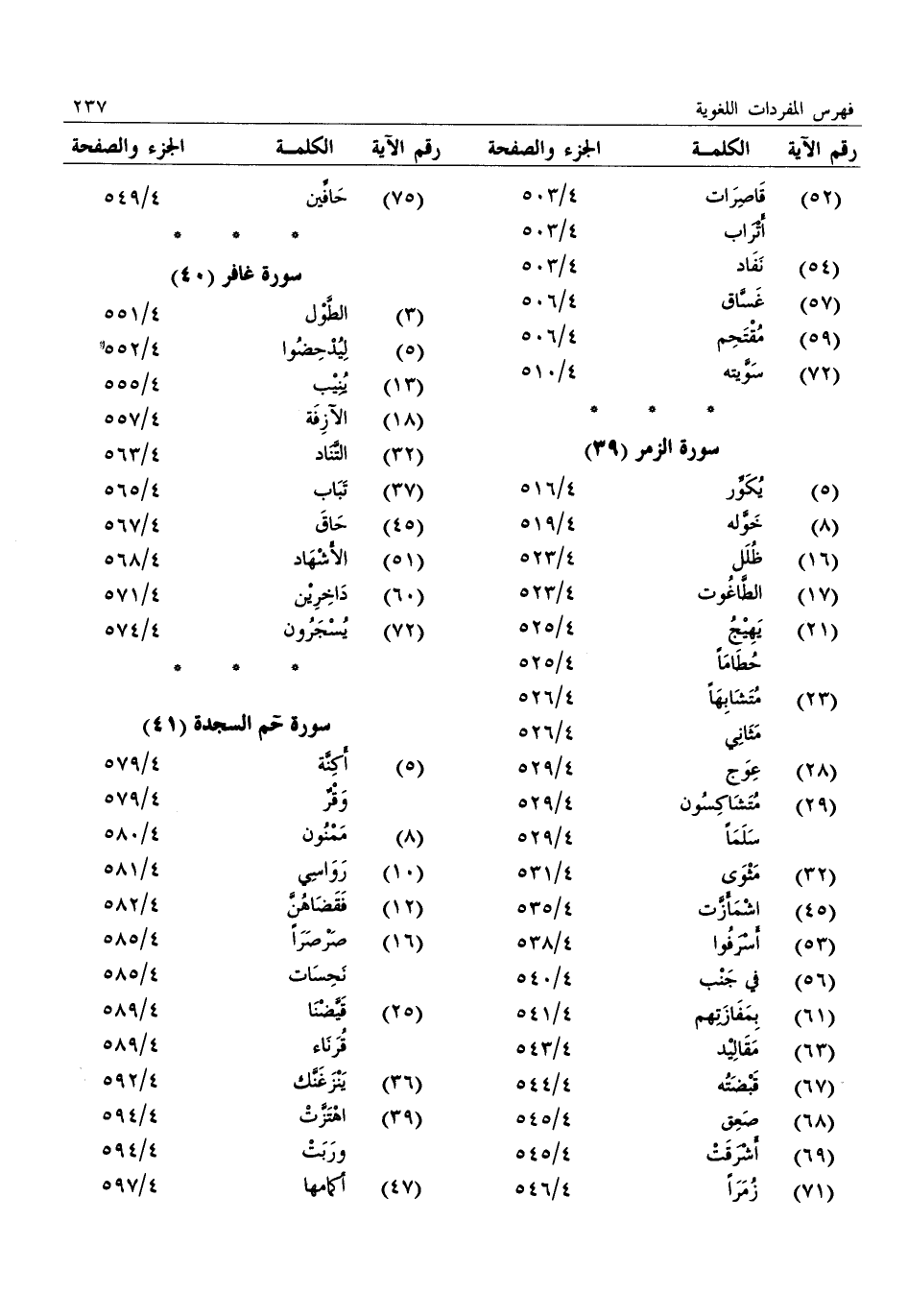(3) : الطّول: 4/ 551 (5) : ليدحضوا: 4/ 552 (13) : ينيب: 4/ 555 (18) : الآزفة: 4/ 557 (32) : التّناد: 4/ 563 (37) : تباب: 4/ 565 (45) : حاق: 4/ 567 (51) : الأشهاد: 4/ 568 (60) : داخرين: 4/ 571 (72) : يسجرون: 4/ 574