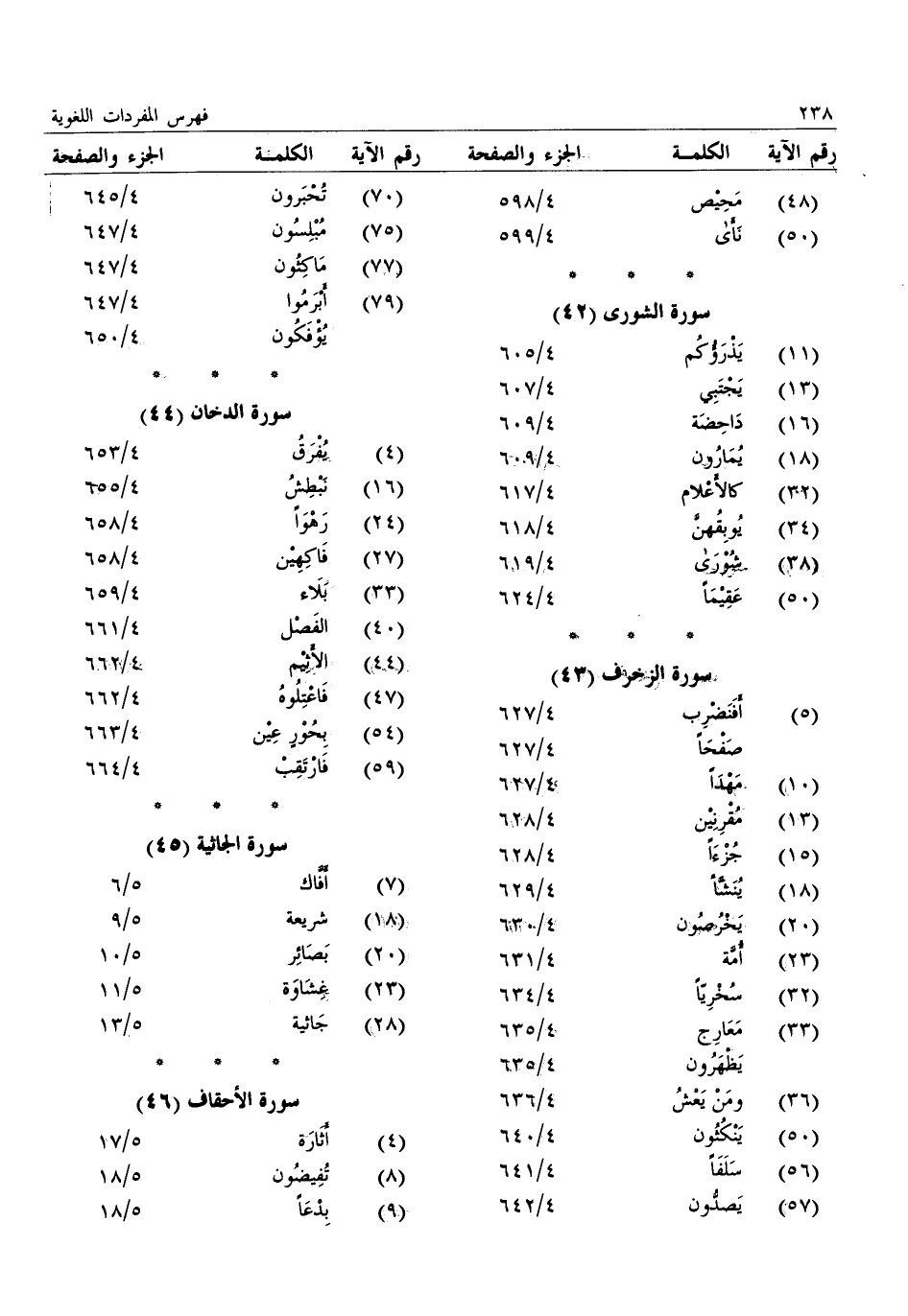 (5) : أفنضرب: 4/ 627: صفحا: 4/ 627 (10) : مهدا: 4/ 627 (13) : مقرنين: 4/ 628 (15) : جزءا: 4/ 628 (18) : ينشّأ: 4/ 629 (20) : يخرصون: 4/ 630 (23) : أمّة: 4/ 631 (32) : سخريّا: 4/ 634 (33) : معارج: 4/ 635: يظهرون: 4/ 635 (36) : ومن يعش: 4/ 636 (50) : ينكثون: 4/ 640 (56) : سلفا: 4/ 641 (57) : يصدّون: 4/ 642 (70) : تحبرون: 4/ 645 (75) : مبلسون: 4/ 647 (77) : ماكثون: 4/ 647 (79) : أبرموا: 4/ 647: يؤفكون: 4/ 650