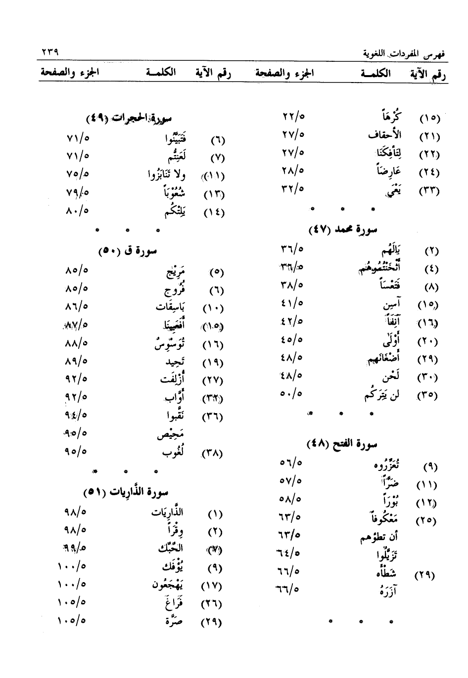 (1) : الذّاريات: 5/ 98 (2) : وقرا: 5/ 98 (7) : الحبك: 5/ 99 (9) : يؤفك: 5/ 100 (17) : يهجعون: 5/ 100 (26) : فراغ: 5/ 105 (29) : صرّة: 5/ 105