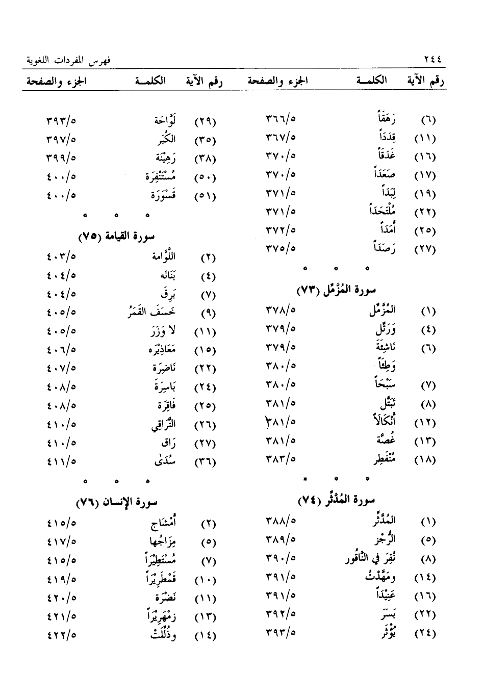 (1) : المزّمّل: 5/ 378 (4) : ورتّل: 5/ 379 (6) : ناشئة: 5/ 379: وطئا: 5/ 380 (7) : سبحا: 5/ 380 (8) : تبتّل: 5/ 381 (12) : أنكالا: 5/ 381 (13) : غصّة: 5/ 381 (18) : منفطر: 5/ 383