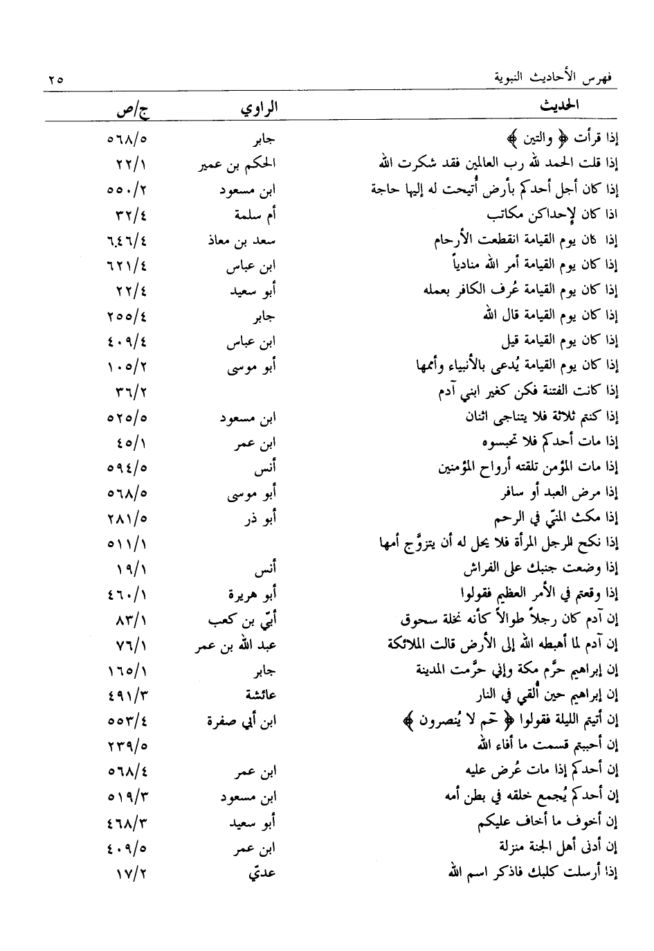 إذا قرأت والتين: جابر: 5/ 568 إِذَا قُلْتَ الْحَمْدُ لِلَّهِ رَبِّ الْعَالَمِينَ فَقَدْ شكرت الله: الحكم بن عمير: 1/ 22 إِذَا كَانَ أَجَلُ أَحَدِكُمْ بِأَرْضٍ أُتِيحَتْ لَهُ إليها حاجة: ابن مسعود: 2/ 550 إذا كان لإحداكن مكاتب: أم سلمة: 4/ 32 إذا كان يوم القيامة انقطعت الأرحام: سعد بن معاذ: 4/ 646 إِذَا كَانَ يَوْمُ الْقِيَامَةِ أَمَرَ اللَّهِ مُنَادِيًا: ابن عباس: 4/ 621 إِذَا كَانَ يَوْمُ الْقِيَامَةِ عُرِفَ الْكَافِرُ بِعَمَلِهِ: أبو سعيد: 4/ 22 إذا كان يوم القيامة قال الله: جابر: 4/ 255 إذا كان يوم القيامة قيل: ابن عباس: 4/ 409 إِذَا كَانَ يَوْمُ الْقِيَامَةِ يُدْعَى بِالْأَنْبِيَاءِ وَأُمَمِهَا: أبو موسى: 2/ 105 إذا كانت الفتنة فكن كغير ابني آدم:: 2/ 36 إذا كنتم ثلاثة فلا يتناجى اثنان: ابن مسعود: 5/ 525 إذا مات أحدكم فلا تحبسوه: ابن عمر: 1/ 45 إذا مات المؤمن تلقته أرواح المؤمنين: أنس: 5/ 594 إذا مرض العبد أو سافر: أبو موسى: 5/ 568 إذا مكث المنيّ في الرحم: أبو ذر: 5/ 281 إذا نكح للرجل المرأة فلا يجل له أن يتزوّج أمها:: 1/ 511 إذا وضعت جنبك على الفراش: أنس: 1/ 19 إذا وقعتم في الأمر العظيم فقولوا: أبو هريرة: 1/ 460 إِنَّ آدَمَ كَانَ رَجُلًا طُوَالًا كَأَنَّهُ نَخْلَةُ سحوق: أبيّ بن كعب: 1/ 83 إِنَّ آدَمَ لَمَّا أَهْبَطَهُ اللَّهُ إِلَى الْأَرْضِ قالت الملائكة: عبد الله بن عمر: 1/ 76 إِنَّ إِبْرَاهِيمَ حَرَّمَ مَكَّةَ وَإِنِّي حَرَّمْتُ الْمَدِينَةَ: جابر: 1/ 165 إن إبراهيم حين ألقي في النار: عائشة: 3/ 491 إِنْ أُتِيتُمُ اللَّيْلَةَ فَقُولُوا حم لَا يُنْصَرُونَ: ابن أبي صفرة: 4/ 553 إن أحببتم قسمت ما أفاء الله:: 5/ 239 إن أحدكم إذا مات عرض عليه: ابن عمر: 4/ 568 إِنَّ أَحَدَكُمْ يُجْمَعُ خَلْقُهُ فِي بَطْنِ أُمِّهِ: ابن مسعود: 3/ 519 إن أخوف ما أخاف عليكم: أبو سعيد: 3/ 468 إن أدنى أهل الجنة منزلة: ابن عمر: 5/ 409 إذا أرسلت كلبك فاذكر اسم الله: عديّ: 2/ 17