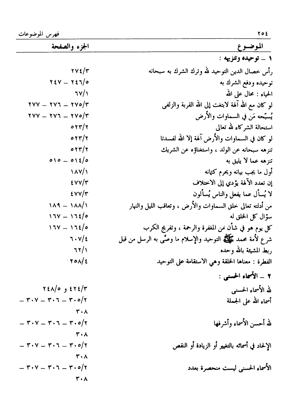 لله الأسماء الحسنى 3/ 424 و 5/ 248 أسماء الله على الجملة 2/ 305- 306- 307- 308 لله أحسن الأسماء وأشرفها 2/ 305- 306- 307- 308 الإلحاد في أسمائه بالتغيير أو الزيادة أو النقص 2/ 305- 306- 307- 308 الأسماء الحسنى ليست منحصرة بعدد 2/ 305- 306- 307- 308