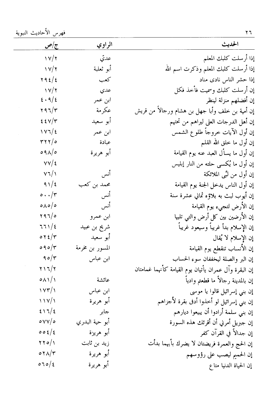 كلبك المعلم: عديّ: 2/ 17 إذا أرسلت كلبك المعلم وذكرت اسم الله: أبو ثعلبة: 2/ 17 إذا حشر الناس نادى مناد: كعب: 4/ 294 إن أرسلت كلبك وسميت فأخذ فكل: عدي: 2/ 17 إن أفضلهم منزلة لينظر: ابن عمر: 4/ 409 إِنَّ أُمَيَّةَ بْنَ خَلَفٍ وَأَبَا جَهْلِ بْنَ هشام ورجالا من قريش: عكرمة: 3/ 296 إِنَّ أَهْلَ الدَّرَجَاتِ الْعُلَى لَيَرَاهُمْ مَنْ تَحْتَهُمْ: أبو سعيد: 3/ 447 إن أول الآيات خروجا طلوع الشمس: ابن عمر: 4/ 176 إن أول ما خلق الله القلم: عبادة: 5/ 322 إِنَّ أَوَّلَ مَا يُسْأَلُ الْعَبْدُ عَنْهُ يَوْمَ القيامة: أبو هريرة: 5/ 598 إن أول ما يكسى حلته من النار إبليس:: 4/ 77 إن أول من لبّى الملائكة: أنس: 1/ 76 إِنَّ أَوَّلَ النَّاسِ يَدْخُلُ الْجَنَّةَ يَوْمَ الْقِيَامَةِ: محمد بن كعب: 4/ 91 إِنَّ أَيُّوبَ لَبِثَ بِهِ بَلَاؤُهُ ثَمَانِيَ عَشْرَةَ سنة: أنس: 3/ 500 إن الأرض لتجيء يوم القيامة: أنس: 5/ 585 إِنَّ الْأَرَضِينَ بَيْنَ كُلِّ أَرْضٍ وَالَّتِي تَلِيهَا: ابن عمرو: 5/ 296 إن الإسلام بدأ غريبا وسيعود غريبا: شريح بن عبيد: 4/ 661 إن الإسلام لا يقال: أبو سعيد: 3/ 524 إن الأنساب تنقطع يوم القيامة: المسور بن مخرمة: 3/ 595 إن البر والصلة ليخففان سوء الحساب: ابن عباس: 3/ 95 إِنَّ الْبَقَرَةَ وَآلَ عِمْرَانَ يَأْتِيَانِ يَوْمَ الْقِيَامَةِ كأنهما غمامتان:: 2/ 216 إن بالمدينة رجالا ما قطعتم واديا: عائشة: 1/ 581 إن بني إسرائيل قالوا يا موسى: ابن عباس: 1/ 173 إن بني إسرائيل لو أخذوا أدفى بقرة لأجزاهم: أبو هريرة: 1/ 117 إِنَّ بَنِي سَلَمَةَ أَرَادُوا أَنْ يَبِيعُوا دِيَارَهُمْ: جابر: 4/ 416 إِنَّ جِبْرِيلَ أَمَرَنِي أَنْ أُقْرِئَكَ هَذِهِ السُّورَةَ: أبو حية البدري: 5/ 577 إن جدالا في القرآن كفر: أبو هريرة: 4/ 554 إِنَّ الْحَجَّ وَالْعُمْرَةَ فَرِيضَتَانِ لَا يَضُرُّكَ بِأَيِّهِمَا بدأت: زيد بن ثابت: 1/ 225 إن الحميم ليصب على رؤوسهم: أبو هريرة: 3/ 528 إن الحياة الدنيا متاع: أبو هريرة: 4/ 565