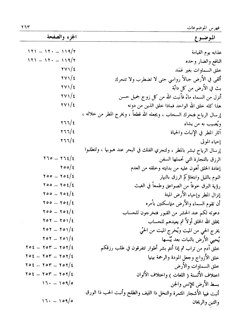 عذابه يوم القيامة 2/ 119- 120- 121 النافع والضار وحده 2/ 119- 120- 121 خلق السماوات بغير عمد 4/ 271 ألقى في الأرض جبالا رواسي حتى لا تضطرب ولا تتحرك 4/ 271 بث في الأرض من كل دابّة 4/ 271 أنزل من السماء ماء فأنبت الله من كل زوج جميل حسن 4/ 271 هذا كله خلق الله الواحد فماذا خلق الذين من دونه 4/ 271 إرسال الرياح فتحرك السحاب، ويجعله الله قطعا، ويخرج المطر من خلاله، ويصيب به من يشاء 4/ 266 آثار المطر في الإنبات والحياة 4/ 266 إحياء الموتى 4/ 266 إرسال الرياح تبشر بالمطر، ولتجري الفلك في البحر عند هبوبها، ولتطلبوا الرزق بالتجارة التي تحملها السفن 4/ 264- 265 إعادة الخلق أهون عليه من بدايته وخلقه من العدم 4/ 255 النوم بالليل وابتغاؤكم الرزق بالنهار 4/ 254- 255 رؤية البرق خوفا من الصواعق وطمعا في الغيث 4/ 254- 255 إنزال المطر وإحياء الأرض الميتة 4/ 254- 255 أن تقوم السماء والأرض متماسكتين بأمره 4/ 254- 255 دعوته لكم عند الحشر من القبور فتخرجون للحساب 4/ 254- 255 يخلق الله الخلق أولا ثم يعيدهم للحساب 4/ 251- 252 يُخْرِجُ الْحَيَّ مِنَ الْمَيِّتِ وَيُخْرِجُ الْمَيِّتَ مِنَ الحيّ 4/ 251- 252 يحيي الأرض بالنبات بعد يبسها 4/ 251- 252 خلق آدم من تراب ثم إذا أنتم بشر أطوار تتفرقون في طلب رزقكم 4/ 252- 253- 254 خلق الأزواج وجعل المودة والرحمة بينها 4/ 252- 253- 254 خلق السماوات والأرض 4/ 252- 253- 254 اختلاف الألسنة (اللغات) واختلاف الألوان 4/ 252- 253- 254 بسط الأرض للإنس والجن 5/ 159- 160 أنبت فيها الأشجار المثمرة والنخل ذا الليف والطلح وأنبت الحب ذا الورق والتبن والريحان 5/ 159- 160