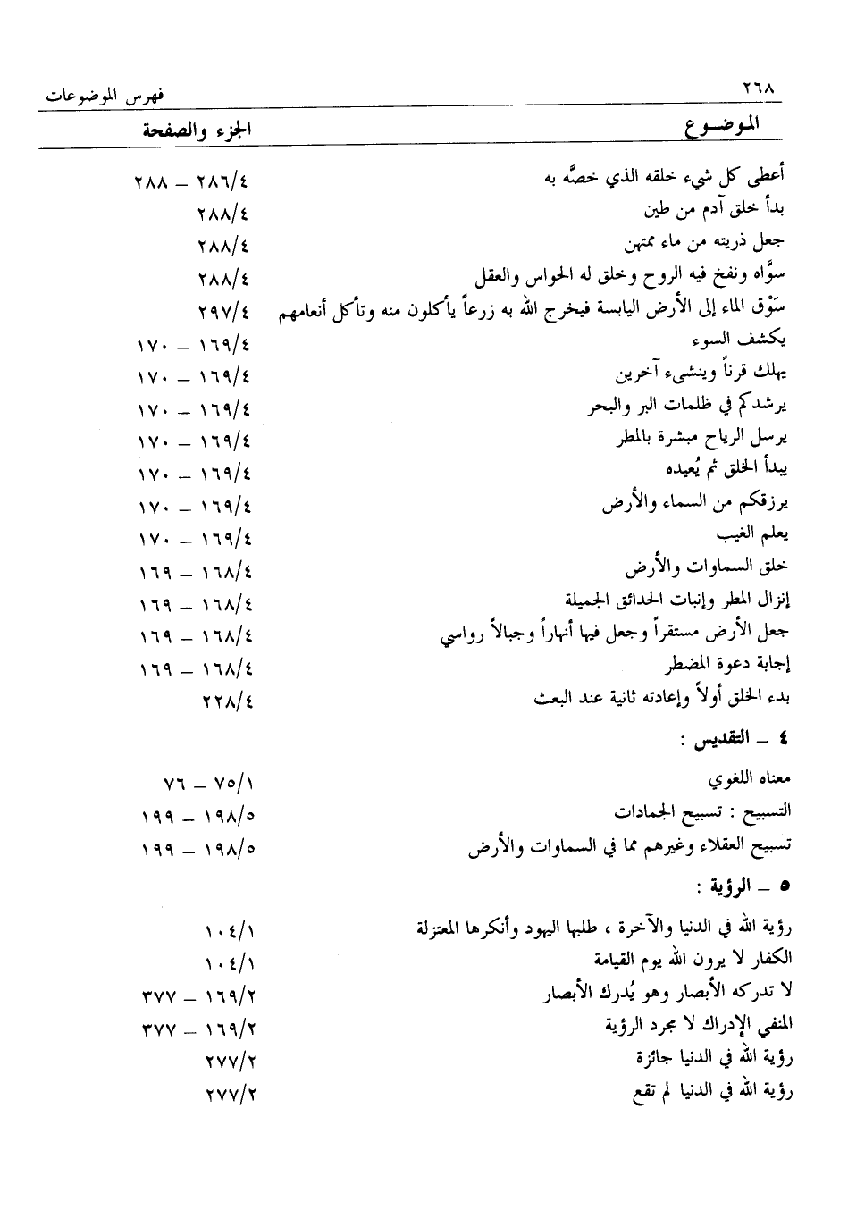 أَعْطَى كُلَّ شَيْءٍ خَلَقَهُ الَّذِي خَصَّهُ بِهِ 4/ 286- 288 بدأ خلق آدم من طين 4/ 288 جعل ذريته من ماء ممتهن 4/ 288 سوّاه ونفخ فيه الروح وخلق له الحواس والعقل 4/ 288 سوق الماء إلى الأرض اليابسة فيخرج الله به زرعا يأكلون منه وتأكل أنعامهم 4/ 297 يكشف السوء 4/ 169- 170 يهلك قرنا وينشئ آخرين 4/ 169- 170 يرشدكم في ظلمات البر والبحر 4/ 169- 170 يرسل الرياح مبشرة بالمطر 4/ 169- 170 يبدأ الخلق ثم يعيده 4/ 169- 170 يرزقكم من السماء والأرض 4/ 169- 170 يعلم الغيب 4/ 169- 170 خلق السماوات والأرض 4/ 168- 169 إنزال المطر وإنبات الحدائق الجميلة 4/ 168- 169 جعل الأرض مستقرا وجعل فيها أنهارا وجبالا رواسي 4/ 168- 169 إجابة دعوة المضطر 4/ 168- 169 بدء الخلق أولا وإعادته ثانية عند البعث 4/ 228
