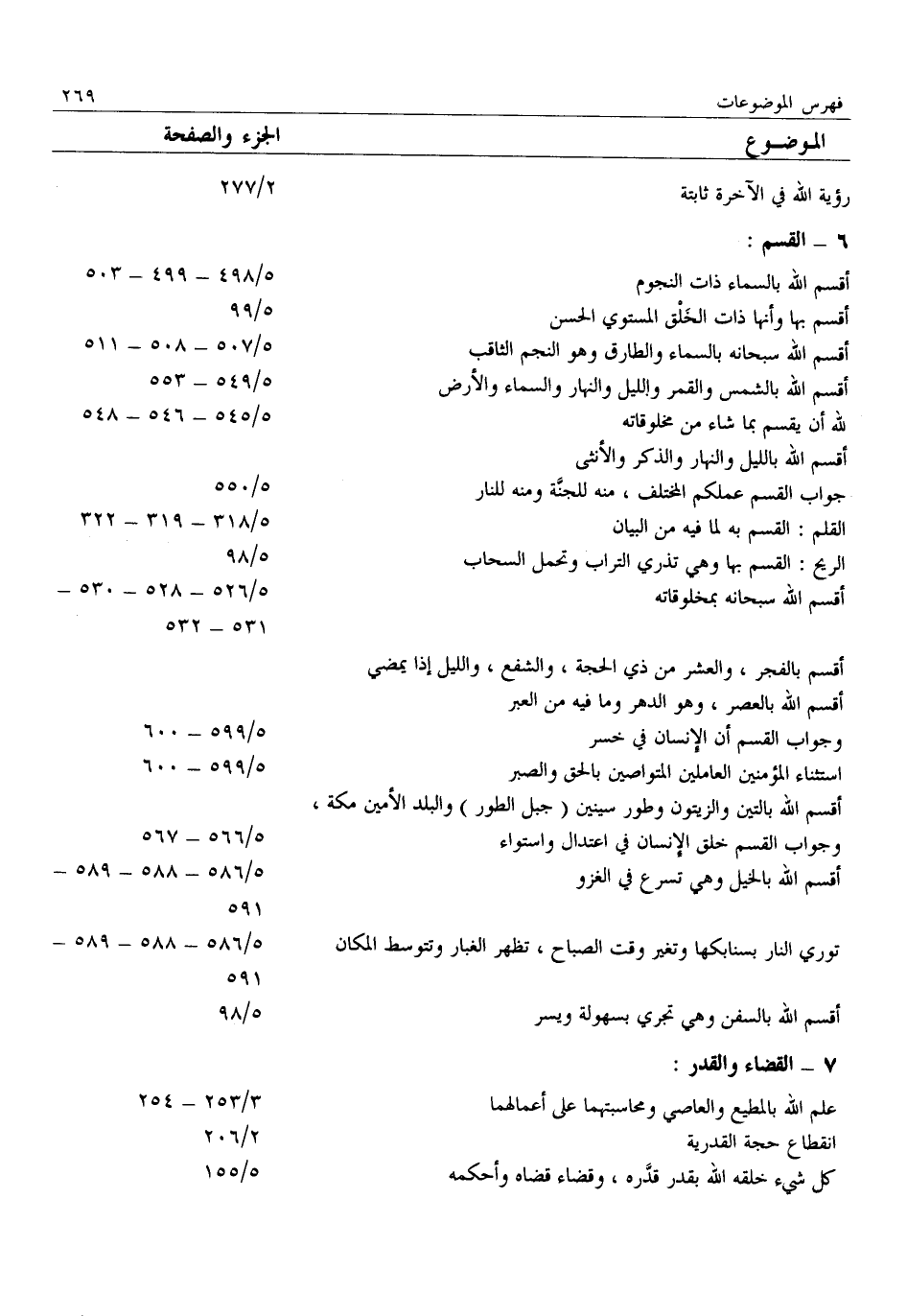 أقسم الله بالسماء ذات النجوم 5/ 498- 499- 503 أقسم بها وأنها ذات الخلق المستوي الحسن 5/ 99 أقسم الله سبحانه بالسماء والطارق وهو النجم الثاقب 5/ 507- 508- 511 أقسم الله بالشمس والقمر والليل والنهار والسماء والأرض 5/ 549- 553 لله أن يقسم بما شاء من مخلوقاته 5/ 545- 546- 548 أقسم الله بالليل والنهار والذكر والأنثى جواب القسم عملكم المختلف، منه للجنّة ومنه للنار 5/ 550 القلم: القسم به لما فيه من البيان 5/ 318- 319- 322 الريح: القسم بها وهي تذري التراب وتحمل السحاب 5/ 98 أقسم الله سبحانه بمخلوقاته 5/ 526- 528- 530- 531- 532 أقسم بالفجر، والعشر من ذي الحجة، والشفع، والليل إذا يمضي أقسم الله بالعصر، وهو الدهر وما فيه من العبر وجواب القسم أن الإنسان في خسر 5/ 599- 600 استثناء المؤمنين العاملين المتواصين بالحق والصبر 5/ 599- 600 أقسم الله بالتين والزيتون وطور سينين (جبل الطور) والبلد الأمين مكة، وجواب القسم خلق الإنسان في اعتدال واستواء 5/ 566- 567 أقسم الله بالخيل وهي تسرع في الغزو 5/ 586- 588- 589- 591 توري النار بسنابكها وتغير وقت الصباح، تظهر الغبار وتتوسط المكان 5/ 586- 588- 589- 591 أقسم الله بالسفن وهي تجري بسهولة ويسر 5/ 98