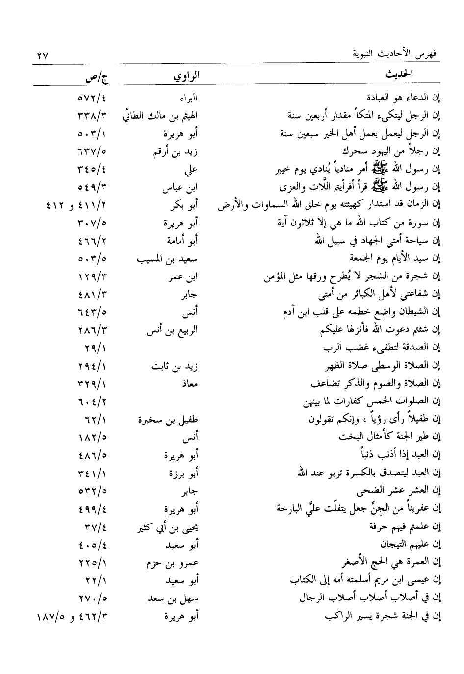 إن الدعاء هو العبادة: البراء: 4/ 572 إِنَّ الرَّجُلَ لِيَتَّكِئُ الْمُتَّكَأَ مِقْدَارَ أَرْبَعِينَ سَنَةً: الهيثم بن مالك الطائي: 3/ 338 إن الرجل ليعمل بعمل أهل الخير سبعين سنة: أبو هريرة: 1/ 503 إن رجلا من اليهود سحرك: زَيْدِ بْنِ أَرْقَمَ: 5/ 637 أَنَّ رَسُولَ اللَّهِ صَلَّى اللَّهُ عَلَيْهِ وَسَلَّمَ أمر مناديا ينادي يوم خبير: عَلِيٍّ: 4/ 345 أَنَّ رَسُولَ اللَّهِ صَلَّى اللَّهُ عَلَيْهِ وَسَلَّمَ قرأ أفرأيتم اللّات والعزى: ابن عباس: 3/ 549 إِنَّ الزَّمَانَ قَدِ اسْتَدَارَ كَهَيْئَتِهِ يَوْمَ خَلَقَ الله السماوات والأرض: أبو بكر: 2/ 411 و 412 إِنَّ سُورَةً مِنْ كِتَابِ اللَّهِ مَا هِيَ إلا ثلاثون آية: أبو هريرة: 5/ 307 إِنَّ سِيَاحَةَ أُمَّتَيِ الْجِهَادُ فِي سَبِيلِ اللَّهِ: أبو أمامة: 2/ 466 إن سيد الأيام يوم الجمعة: سعيد بن المسيب: 5/ 503 إِنَّ شَجَرَةً مِنَ الشَّجَرِ لَا يَطَّرِحُ وَرَقُهَا مثل المؤمن: ابن عمر: 3/ 129 إن شفاعتي لأهل الكبائر من أمتي: جابر: 3/ 481 إِنَّ الشَّيْطَانَ وَاضِعٌ خَطْمَهُ عَلَى قَلْبِ ابْنِ آدم: أنس: 5/ 643 إن شئتم دعوت الله فأنزلها عليكم: الربيع بن أنس: 3/ 286 إن الصدقة لتطفئ غضب الرب:: 1/ 29 إن الصلاة الوسطى صلاة الظهر: زيد بن ثابت: 1/ 294 إن الصلاة والصوم والذكر تضاعف: معاذ: 1/ 329 إن الصلوات الخمس كفارات لما بينهن:: 2/ 604 إن طفيلا رأى رؤيا، وإنكم تقولون: طفيل بن سخبرة: 1/ 62 إن طير الجنة كأمثال البخت: أنس: 5/ 182 إن العبد إذا أذنب ذنبا: أبو هريرة: 5/ 486 إِنَّ الْعَبْدَ لَيَتَصَدَّقُ بِالْكِسْرَةِ تَرْبُو عِنْدَ اللَّهِ: أبو برزة: 1/ 341 إن العشر عشر الضحى: جابر: 5/ 532 إِنَّ عِفْرِيتًا مِنَ الْجِنِّ جَعَلَ يَتَفَلَّتُ عَلَيَّ البارحة: أبو هريرة: 4/ 499 إن علمتم فيهم حرفة: يحيى بن أبي كثير: 4/ 37 إن عليهم التيجان: أبو سعيد: 4/ 405 إن العمرة هي الحج الأصغر: عمرو بن حزم: 1/ 225 إِنَّ عِيسَى ابْنَ مَرْيَمَ أَسْلَمَتْهُ أُمُّهُ إِلَى الكتاب: أبو سعيد: 1/ 22 إن في أصلاب أصلاب أصلاب الرجال: سهل بن سعد: 5/ 270 إن في الجنة شجرة يسير الراكب: أبو هريرة: 3/ 462 و 5/ 187