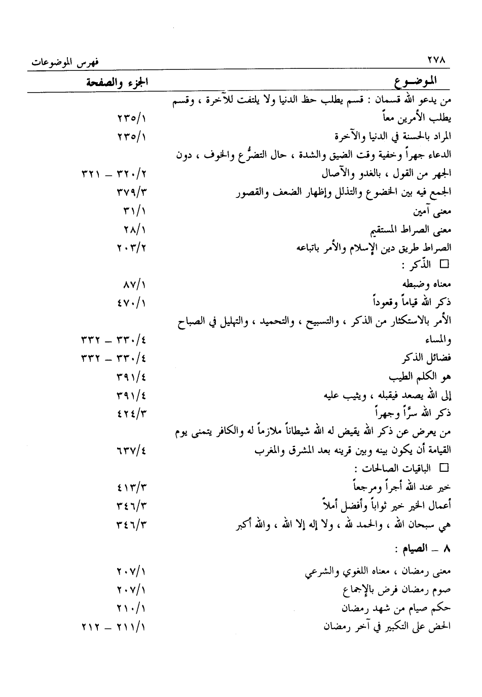 معناه وضبطه 1/ 87 ذكر الله قياما وقعودا 1/ 470 الأمر بالاستكثار من الذكر، والتسبيح، والتحميد، والتهليل في الصباح والمساء 4/ 330- 332 فضائل الذكر 4/ 330- 332 هو الكلم الطيب 4/ 391 إلى الله يصعد فيقبله، ويثيب عليه 4/ 391 ذكر الله سرّا وجهرا 3/ 424 من يعرض عن ذكر الله يقيض له الله شيطانا ملازما له والكافر يتمنى يوم القيامة أن يكون بينه وبين قرينه بعد المشرق والمغرب 4/ 637 الباقيات الصالحات: