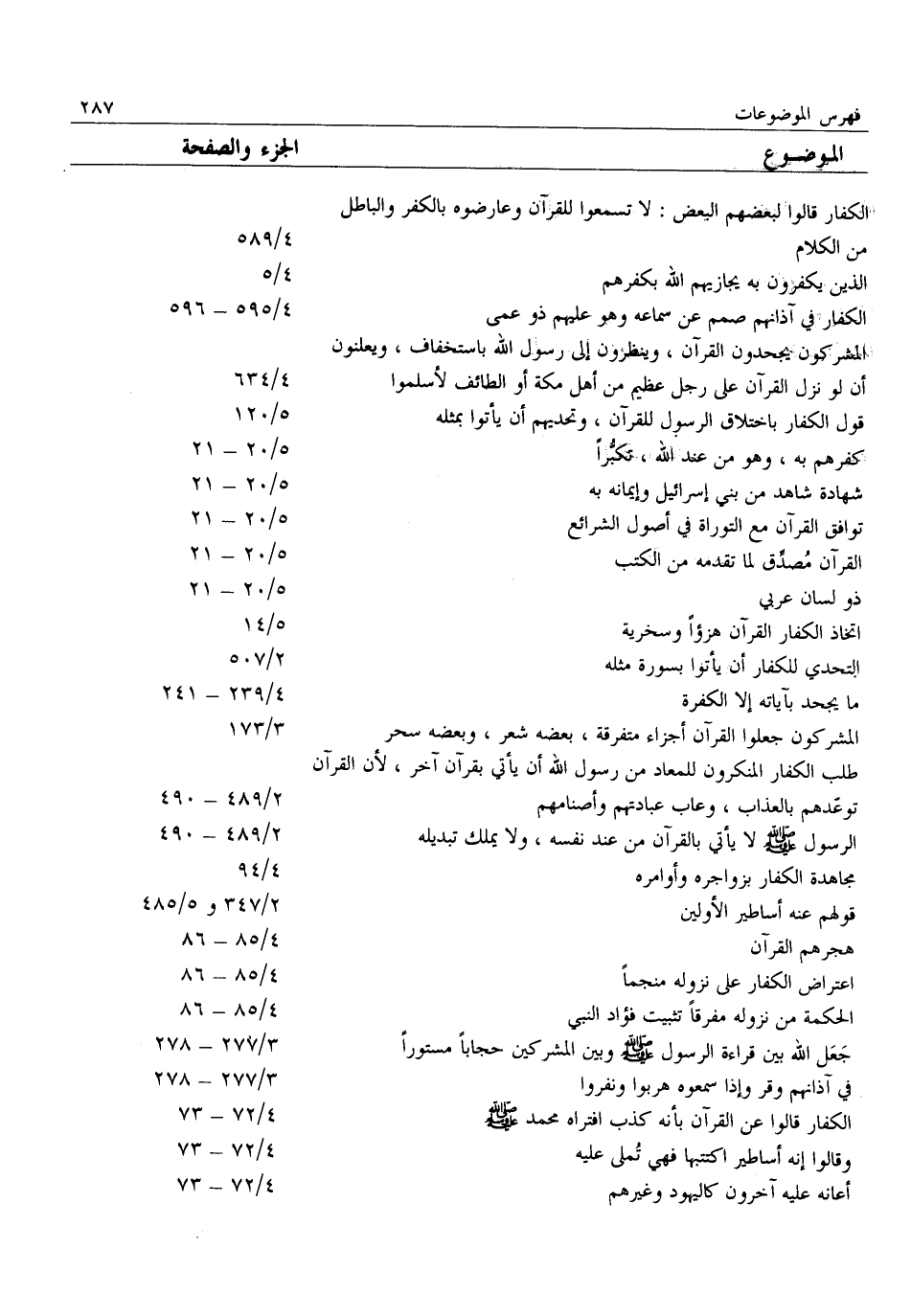 الكفار قالوا لبعضهم البعض: لا تسمعوا للقرآن وعارضوه بالكفر والباطل من الكلام 4/ 589 الذين يكفرون به يجازيهم الله بكفرهم 4/ 5 الكفار في آذانهم صمم عن سماعه وهو عليهم ذو عمى 4/ 595- 596 المشركون يجحدون القرآن، وينظرون إلى رسول الله باستخفاف، ويعلنون أن لو نزل القرآن على رجل عظيم من أهل مكة أو الطائف لأسلموا 4/ 634 قول الكفار باختلاق الرسول للقرآن، وتحديهم أن يأتوا بمثله 5/ 120 كفرهم به، وهو من عند الله، تكبّرا 5/ 20- 21 شهادة شاهد من بني إسرائيل وإيمانه به 5/ 20- 21 توافق القرآن مع التوراة في أصول الشرائع 5/ 20- 21 القرآن مصدّق لما تقدمه من الكتب 5/ 20- 21 ذو لسان عربي 5/ 20- 21 اتخاذ الكفار القرآن هزؤا وسخرية 5/ 14 التحدي للكفار أن يأتوا بسورة مثله 2/ 507 ما يجحد بآياته إلا الكفرة 4/ 239- 241 المشركون جَعَلُوا الْقُرْآنَ أَجْزَاءً مُتَفَرِّقَةً، بَعْضُهُ شِعْرٌ، وَبَعْضُهُ سحر 3/ 173 طلب الكفار المنكرون للمعاد من رسول الله أن يأتي بقرآن آخر، لأن القرآن توعّدهم بالعذاب، وعاب عبادتهم وأصنامهم 2/ 489- 490 الرسول صلّى الله عليه وسلم لا يأتي بالقرآن من عند نفسه، ولا يملك تبديله 2/ 489- 490 مجاهدة الكفار بزواجره وأوامره 4/ 94 قولهم عنه أساطير الأولين 2/ 347 و 5/ 485 هجرهم القرآن 4/ 85- 86 اعتراض الكفار على نزوله منجما 4/ 85- 86 الحكمة من نزوله مفرقا تثبيت فؤاد النبي 4/ 85- 86 جعل الله بين قراءة الرسول صلّى الله عليه وسلم وبين المشركين حجابا مستورا 3/ 277- 278 في آذانهم وقر وإذا سمعوه هربوا ونفروا 3/ 277- 278 الكفار قالوا عن القرآن بأنه كذب افتراه محمد صلّى الله عليه وسلم 4/ 72- 73 وقالوا إنه أساطير اكتتبها فهي تملى عليه 4/ 72- 73 أعانه عليه آخرون كاليهود وغيرهم 4/ 72- 73