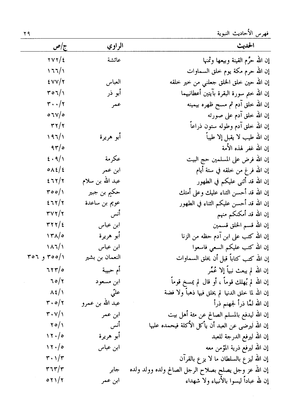 إن الله حرّم القينة وبيعها وثمنها: عائشة: 4/ 272 إِنَّ اللَّهَ حَرَّمَ مَكَّةَ يَوْمَ خَلَقَ السَّمَاوَاتِ:: 1/ 166 إِنَّ اللَّهَ حِينَ خَلَقَ الْخَلْقَ جَعَلَنِي مِنْ خير خلقه: العباس: 2/ 477 إِنَّ اللَّهَ خَتَمَ سُورَةَ الْبَقَرَةِ بِآيَتَيْنِ أَعْطَانِيهِمَا: أبو ذر: 1/ 356 إِنَّ اللَّهَ خَلَقَ آدَمَ ثُمَّ مَسَحَ ظَهْرَهُ بيمينه: عمر: 2/ 300 إن الله خلق آدم على صورته:: 5/ 567 إِنَّ اللَّهَ خَلَقَ آدَمَ وَطُولُهُ سِتُّونَ ذِرَاعًا:: 2/ 32 إِنَّ اللَّهَ طَيِّبٌ لَا يَقْبَلُ إِلَّا طَيِّبًا: أبو هريرة: 1/ 196 إن الله غفر لهذه الأمة:: 5/ 93 إِنَّ اللَّهَ فَرَضَ عَلَى الْمُسْلِمِينَ حَجَّ الْبَيْتِ: عكرمة: 1/ 409 إِنَّ اللَّهَ فَرَغَ مِنْ خَلْقِهِ فِي سِتَّةِ أيام: ابن عمر: 4/ 584 إِنَّ اللَّهَ قَدْ أَثْنَى عَلَيْكُمْ فِي الطُّهُورِ: عبد الله بن سلام: 2/ 462 إِنَّ اللَّهَ قَدْ أَحْسَنَ الثَّنَاءَ عَلَيْكَ وَعَلَى أمتك: حكيم بن جبير: 1/ 355 إِنَّ اللَّهَ قَدْ أَحْسَنَ عَلَيْكُمُ الثَّنَاءَ فِي الطهور: عويم بن ساعدة: 2/ 462 إن الله قد أمكنكم منهم: أنس: 2/ 372 إن الله قسم الخلق قسمين: ابن عباس: 4/ 322 إِنَّ اللَّهَ كَتَبَ عَلَى ابْنِ آدَمَ حَظَّهُ من الزنا: أبو هريرة: 5/ 138 إن الله كتب عليكم السعي فاسعوا: ابن عباس: 1/ 186 إِنَّ اللَّهَ كَتَبَ كِتَابًا قَبْلَ أَنْ يَخْلُقَ السماوات: النعمان بن بشير: 1/ 355 و 356 إِنَّ اللَّهَ لَمْ يَبْعَثْ نَبِيًّا إِلَّا عُمِّرَ: أم حبيبة: 5/ 623 إِنَّ اللَّهَ لَمْ يُهْلِكْ قَوْمًا، أَوْ قَالَ لم يمسخ قوما: ابن مسعود: 2/ 65 إِنَّ اللَّهَ لَمَّا خَلَقَ الدُّنْيَا لَمْ يَخْلُقْ فيها ذهبا ولا فضة: عليّ: 1/ 84 إن الله لمّا ذرأ لجهنم ذرأ: عبد الله بن عمرو: 2/ 305 إِنَّ اللَّهَ لَيَدْفَعُ بِالْمُسْلِمِ الصَّالِحِ عَنْ مِائَةِ أهل بيت: ابن عمر: 1/ 307 إِنَّ اللَّهَ لَيَرْضَى عَنِ الْعَبْدِ أَنْ يَأْكُلَ الأكلة فيحمده عليها: أنس: 1/ 25 إن الله ليرفع الدرجة للعبد: أبو هريرة: 5/ 120 إن الله ليرفع ذرية المؤمن معه: ابن عباس: 5/ 120 إِنَّ اللَّهَ لَيَزَعُ بِالسُّلْطَانِ مَا لَا يَزَعُ بالقرآن:: 3/ 301 إِنَّ اللَّهَ عَزَّ وَجَلَّ يُصْلِحُ بِصَلَاحِ الرَّجُلِ الصالح ولده وولد ولده: جابر: 3/ 363 إِنَّ لِلَّهِ عِبَادًا لَيْسُوا بِالْأَنْبِيَاءِ وَلَا شُهَدَاءَ: ابن عمر: 2/ 521