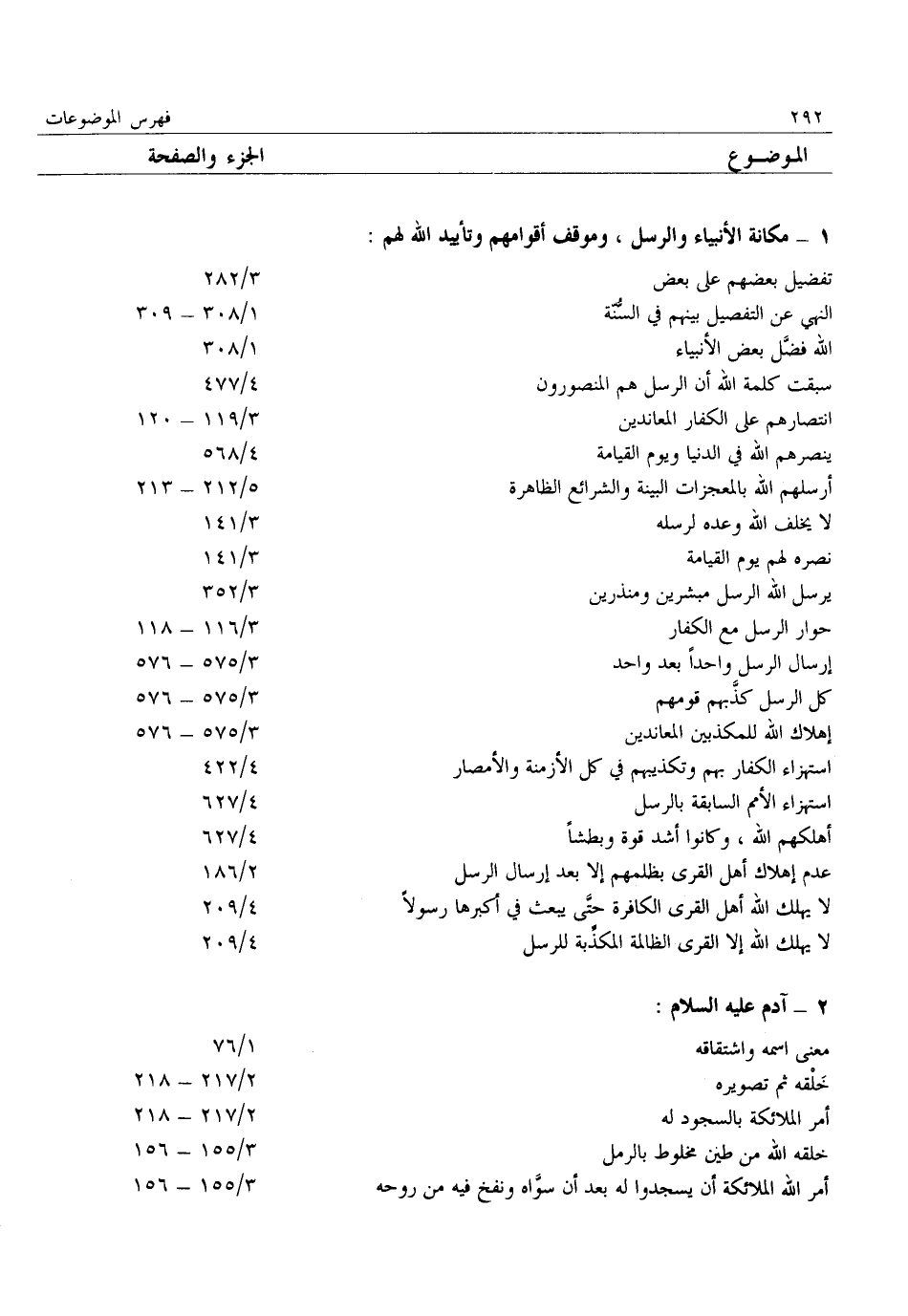 تفضيل بعضهم على بعض 3/ 282 النهي عن التفصيل بينهم في السّنّة 1/ 308- 309 الله فضّل بعض الأنبياء 1/ 308 سبقت كلمة الله أن الرسل هم المنصورون 4/ 477 انتصارهم على الكفار المعاندين 3/ 119- 120 ينصرهم الله في الدنيا ويوم القيامة 4/ 568 أرسلهم الله بالمعجزات البينة والشرائع الظاهرة 5/ 212- 213 لا يخلف الله وعده لرسله 3/ 141 نصره لهم يوم القيامة 3/ 141 يرسل الله الرسل مبشرين ومنذرين 3/ 352 حوار الرسل مع الكفار 3/ 116- 118 إرسال الرسل واحدا بعد واحد 3/ 575- 576 كل الرسل كذّبهم قومهم 3/ 575- 576 إهلاك الله للمكذبين المعاندين 3/ 575- 576 استهزاء الكفار بهم وتكذيبهم في كل الأزمنة والأمصار 4/ 422 استهزاء الأمم السابقة بالرسل 4/ 627 أهلكهم الله، وكانوا أشد قوة وبطشا 4/ 627 عدم إهلاك أهل القرى بظلمهم إلا بعد إرسال الرسل 2/ 186 لا يهلك الله أهل القرى الكافرة حتّى يبعث في أكبرها رسولا 4/ 209 لا يهلك الله إلا القرى الظالمة المكذّبة للرسل 4/ 209