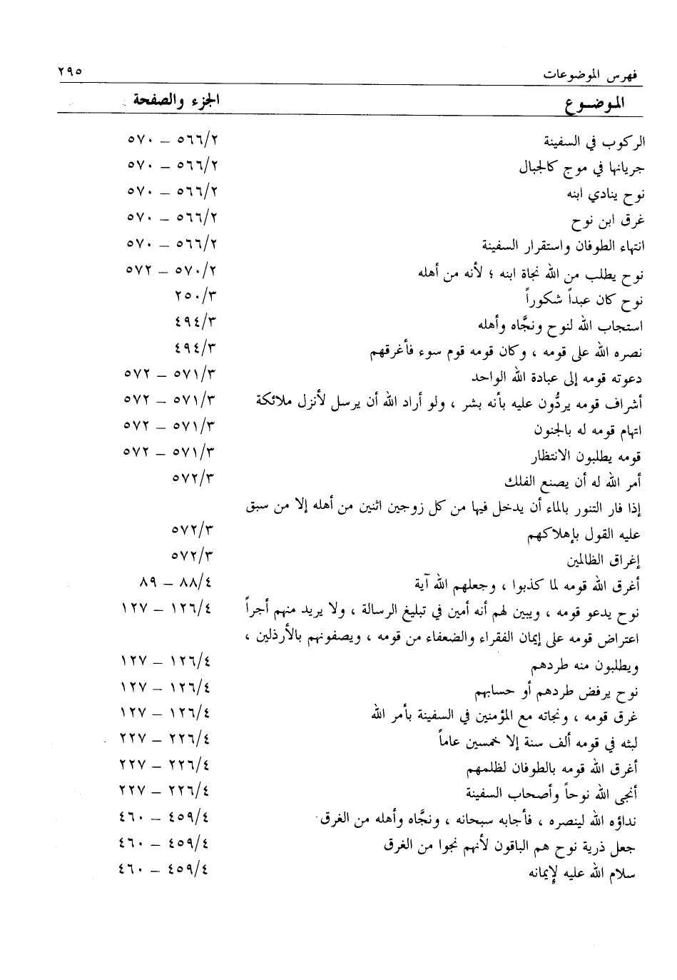 الركوب في السفينة 2/ 566- 570 جريانها في موج كالجبال 2/ 566- 570 نوح ينادي ابنه 2/ 566- 570 غرق ابن نوح 2/ 566- 570 انتهاء الطوفان واستقرار السفينة 2/ 566- 570 نوح يطلب من الله نجاة ابنه لأنه من أهله 2/ 570- 572 نوح كان عبدا شكورا 3/ 250 استجاب الله لنوح ونجّاه وأهله 3/ 494 نصره الله على قومه، وكان قومه قوم سوء فأغرقهم 3/ 494 دعوته قومه إلى عبادة الله الواحد 3/ 571- 572 أشراف قومه يردّون عليه بأنه بشر، ولو أراد الله أن يرسل لأنزل ملائكة 3/ 571- 572 اتهام قومه له بالجنون 3/ 571- 572 قومه يطلبون الانتظار 3/ 571- 572 أمر الله له أن يصنع الفلك 3/ 572 إذا فار التنور بالماء أن يدخل فيها من كل زوجين اثنين من أهله إلا من سبق عليه القول بإهلاكهم 3/ 572 إغراق الظالمين 3/ 572 أغرق الله قومه لما كذبوا، وجعلهم الله آية 4/ 88- 89 نوح يدعو قومه، ويبين لهم أنه أمين في تبليغ الرسالة، ولا يريد منهم أجرا 4/ 126- 127 اعتراض قومه على إيمان الفقراء والضعفاء من قومه، ويصفونهم بالأرذلين، ويطلبون منه طردهم 4/ 126- 127 نوح يرفض طردهم أو حسابهم 4/ 126- 127 غرق قومه، ونجاته مع المؤمنين في السفينة بأمر الله 4/ 126- 127 لبثه فِي قَوْمِهِ أَلْفَ سَنَةٍ إِلَّا خَمْسِينَ عَامًا 4/ 226- 227 أغرق الله قومه بالطوفان لظلمهم 4/ 226- 227 أنجى الله نوحا وأصحاب السفينة 4/ 226- 227 نداؤه الله لينصره، فأجابه سبحانه، ونجّاه وأهله من الغرق 4/ 459- 460 جعل ذرية نوح هم الباقون لأنهم نجوا من الغرق 4/ 459- 460 سلام الله عليه لإيمانه 4/ 459- 460