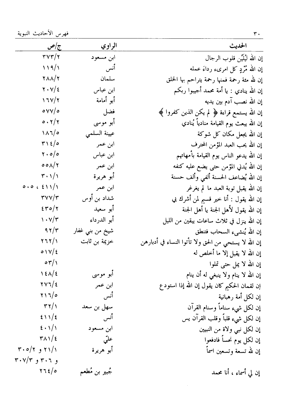 إن الله ليليّن قلوب الرجال: ابن مسعود: 2/ 373 إِنَّ اللَّهَ مُرْدٍ كُلَّ امْرِئٍ رِدَاءَ عَمَلِهِ: أنس: 1/ 119 إِنَّ لِلَّهِ مِائَةَ رَحْمَةٍ فَمِنْهَا رَحْمَةٌ يَتَرَاحَمُ بها الخلق: سلمان: 2/ 288 إن الله ينادي: يا أمة محمد أجيبوا ربكم: ابن عباس: 4/ 207 إن الله نصب آدم بين يديه: أبو أمامة: 2/ 167 إِنَّ اللَّهَ يَسْتَمِعُ قِرَاءَةَ لَمْ يَكُنِ الَّذِينَ كفروا: فضل: 5/ 577 إِنَّ اللَّهَ يَبْعَثُ يَوْمَ الْقِيَامَةِ مُنَادِيًا يُنَادِي: أبو موسى: 2/ 502 إن الله يجعل مكان كل شوكة: عيينة السلمي: 5/ 186 إن الله يحب العبد المؤمن المحترف: ابن عمر: 5/ 314 إِنَّ اللَّهَ يَدْعُو النَّاسَ يَوْمَ الْقِيَامَةِ بِأُمَّهَاتِهِمْ: ابن عباس: 5/ 205 إن الله يدني المؤمن حتى يضع عليه كنفه: ابن عمر: 2/ 558 إن الله يضاعف الحسنة ألفي وألف حسنة: أبو هريرة: 1/ 301 إِنَّ اللَّهَ يَقْبَلُ تَوْبَةَ الْعَبْدِ مَا لَمْ يغرغر: ابن عمر: 1/ 411، 505 إِنَّ اللَّهَ يَقُولُ: أَنَا خَيْرُ قَسِيمٍ لِمَنْ أشرك بي: شداد بن أوس: 3/ 377 إِنَّ اللَّهَ يَقُولُ لِأَهْلِ الْجَنَّةِ يَا أَهْلَ الجنة: أبو سعيد: 2/ 435 إِنَّ اللَّهَ يَنْزِلُ فِي ثَلَاثِ سَاعَاتٍ يَبْقَيْنَ من الليل: أبو الدرداء: 3/ 107 إن الله ينشئ السحاب فتنطق: شيخ من بني غفار: 3/ 92 إن الله لا يستحي من الحق ولا تأتوا النساء في أدبارهن: خزيمة بن ثابت: 1/ 262 إِنَّ اللَّهَ لَا يَقْبَلُ إِلَّا مَا أُخْلِصَ له: 4/ 517 إِنَّ اللَّهَ لَا يَقْبَلُ إِلَّا مَا أُخْلِصَ له:: 4/ 517 إن الله لا يمل حتى تملوا:: 1/ 53 إِنَّ اللَّهَ لَا يَنَامُ وَلَا يَنْبَغِي لَهُ أن ينام: أبو موسى: 4/ 148 إِنَّ لُقْمَانَ الْحَكِيمَ كَانَ يَقُولُ إِنَّ اللَّهَ إذا استودع: ابن عمر: 4/ 276 إن لكل أمة رهبانية: أنس: 5/ 216 إن لكل شيء سناما وسنام القرآن: سهل بن سعد: 1/ 32 إِنَّ لِكُلِّ شَيْءٍ قَلْبًا وَقَلْبُ الْقُرْآنِ يس: أنس: 4/ 411 إن لكل نبي ولاة من النبيين: ابن مسعود: 1/ 401 إن لكل يوم نحسا فادفعوا: عليّ: 4/ 381 إن لله تسعة وتسعين اسما: أبو هريرة: 1/ 21 و 2/ 305 و 306 و 3/ 307 إن لي أسماء، أنا محمد: جبير بن مطعم: 5/ 264