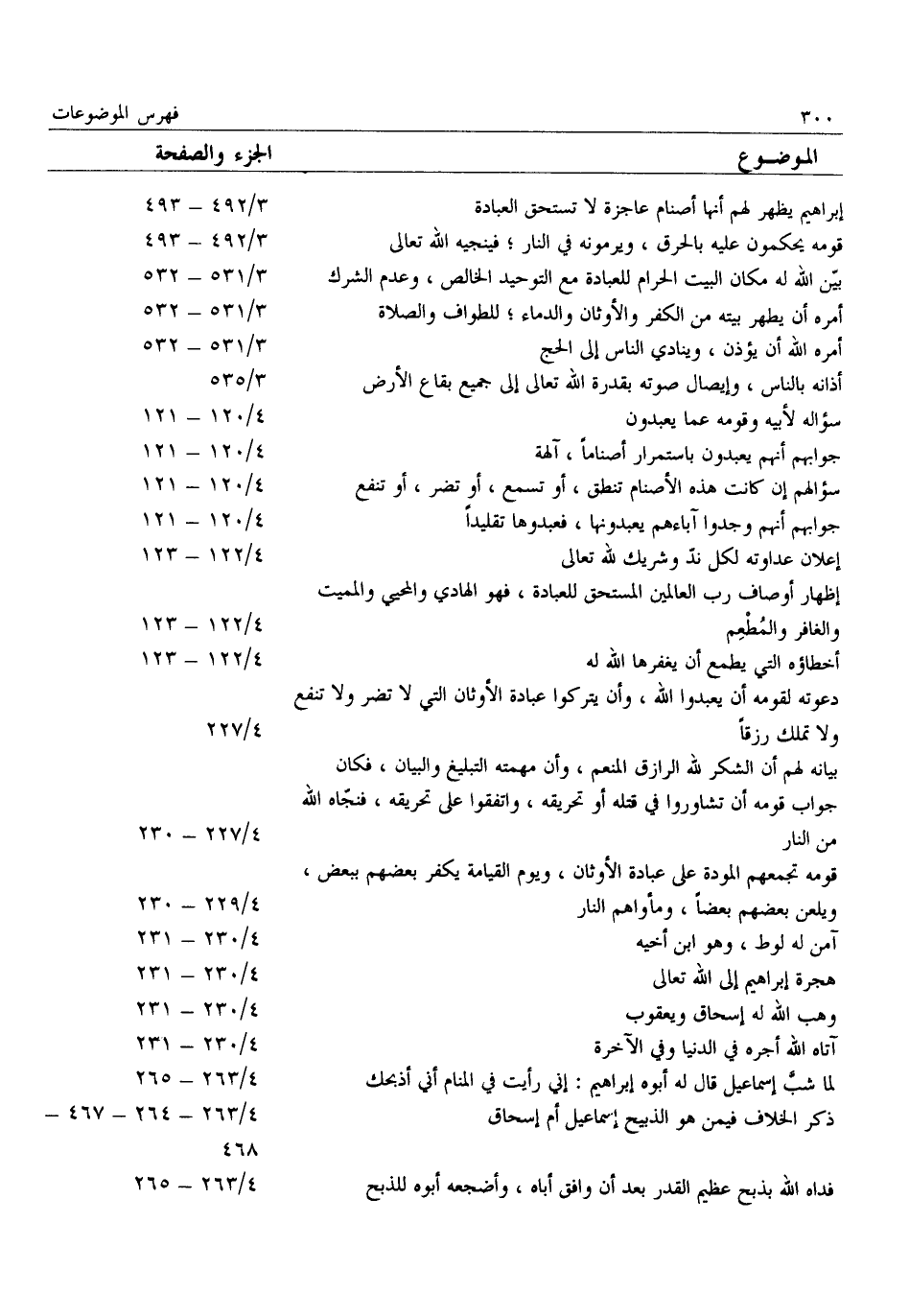 إبراهيم يظهر لهم أنها أصنام عاجزة لا تستحق العبادة 3/ 492- 493 قومه يحكمون عليه بالحرق، ويرمونه في النار فينجيه الله تعالى 3/ 492- 493 بيّن الله له مكان البيت الحرام للعبادة مع التوحيد الخالص، وعدم الشرك 3/ 531- 532 أمره أن يطهر بيته من الكفر والأوثان والدماء للطواف والصلاة 3/ 531- 532 أمره الله أن يؤذن، وينادي الناس إلى الحج 3/ 531- 532 أذانه بالناس، وإيصال صوته بقدرة الله تعالى إلى جميع بقاع الأرض 3/ 535 سؤاله لأبيه وقومه عما يعبدون 4/ 120- 121 جوابهم أنهم يعبدون باستمرار أصناما، آلهة 4/ 120- 121 سؤالهم إن كانت هذه الأصنام تنطق، أو تسمع، أو تضر، أو تنفع 4/ 120- 121 جوابهم أنهم وجدوا آباءهم يعبدونها، فعبدوها تقليدا 4/ 120- 121 إعلان عداوته لكل ندّ وشريك لله تعالى 4/ 122- 123 إظهار أوصاف رب العالمين المستحق للعبادة، فهو الهادي والمحيي والمميت والغافر والمطعم 4/ 122- 123 أخطاؤه التي يطمع أن يغفرها الله له 4/ 122- 123 دعوته لقومه أن يعبدوا الله، وأن يتركوا عبادة الأوثان التي لا تضر ولا تنفع ولا تملك رزقا 4/ 227 بيانه لهم أن الشكر لله الرازق المنعم، وأن مهمته التبليغ والبيان، فكان جواب قومه أن تشاوروا في قتله أو تحريقه، واتفقوا على تحريقه، فنجّاه الله من النار 4/ 227- 230 قومه تجمعهم المودة على عبادة الأوثان، ويوم القيامة يكفر بعضهم ببعض، ويلعن بعضهم بعضا، ومأواهم النار 4/ 229- 230 آمن له لوط، وهو ابن أخيه 4/ 230- 231 هجرة إبراهيم إلى الله تعالى 4/ 230- 231 وهب الله له إسحاق ويعقوب 4/ 230- 231 آتاه الله أجره في الدنيا وفي الآخرة 4/ 230- 231 لما شبّ إسماعيل قال له أبوه إبراهيم: إني رأيت في المنام أني أذبحك 4/ 263- 265 ذكر الخلاف فيمن هو الذبيح إسماعيل أم إسحاق 4/ 263- 264- 467- 468 فداه الله بذبح عظيم القدر بعد أن وافق أباه، وأضجعه أبوه للذبح 4/ 263- 265