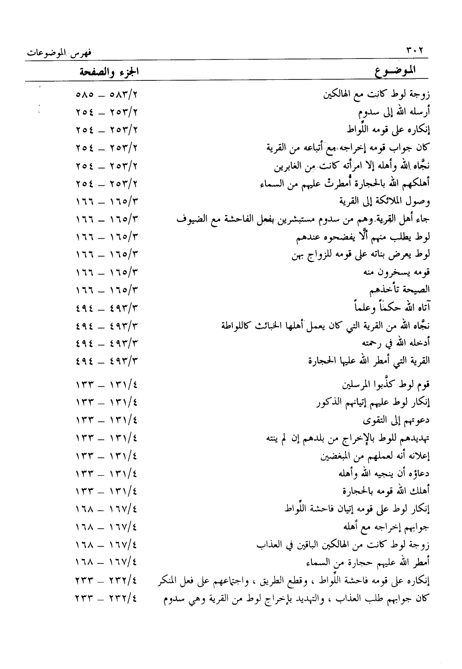 زوجة لوط كانت مع الهالكين 2/ 583- 585 أرسله الله إلى سدوم 2/ 253- 254 إنكاره على قومه اللّواط 2/ 253- 254 كان جواب قومه إخراجه مع أتباعه من القرية 2/ 253- 254 نجّاه الله وأهله إلا امرأته كانت من الغابرين 2/ 253- 254 أهلكهم الله بالحجارة أمطرت عليهم من السماء 2/ 253- 254 وصول الملائكة إلى القرية 3/ 165- 166 جاء أهل القرية وهم من سدوم مستبشرين بفعل الفاحشة مع الضيوف 3/ 165- 166 لوط يطلب منهم ألّا يفضحوه عندهم 3/ 165- 166 لوط يعرض بناته على قومه للزواج بهن 3/ 165- 166 قومه يسخرون منه 3/ 165- 166 الصيحة تأخذهم 3/ 165- 166 آتاه الله حكما وعلما 3/ 493- 494 نجّاه الله من القرية التي كان يعمل أهلها الخبائث كاللواطة 3/ 493- 494 أدخله الله في رحمته 3/ 493- 494 القرية التي أمطر الله عليها الحجارة 3/ 493- 494 قوم لوط كذّبوا المرسلين 4/ 131- 133 إنكار لوط عليهم إتيانهم الذكور 4/ 131- 133 دعوتهم إلى التقوى 4/ 131- 133 تهديدهم للوط بالإخراج من بلدهم إن لم ينته 4/ 131- 133 إعلانه أنه لعملهم من المبغضين 4/ 131- 133 دعاؤه أن ينجيه الله وأهله 4/ 131- 133 أهلك الله قومه بالحجارة 4/ 131- 133 إنكار لوط على قومه إتيان فاحشة اللّواط 4/ 167- 168 جوابهم إخراجه مع أهله 4/ 167- 168 زوجة لوط كانت من الهالكين الباقين في العذاب 4/ 167- 168 أمطر الله عليهم حجارة من السماء 4/ 167- 168 إنكاره على قومه فاحشة اللّواط، وقطع الطريق، واجتماعهم على فعل المنكر 4/ 232- 233 كان جوابهم طلب العذاب، والتهديد بإخراج لوط من القرية وهي سدوم 4/ 232- 233