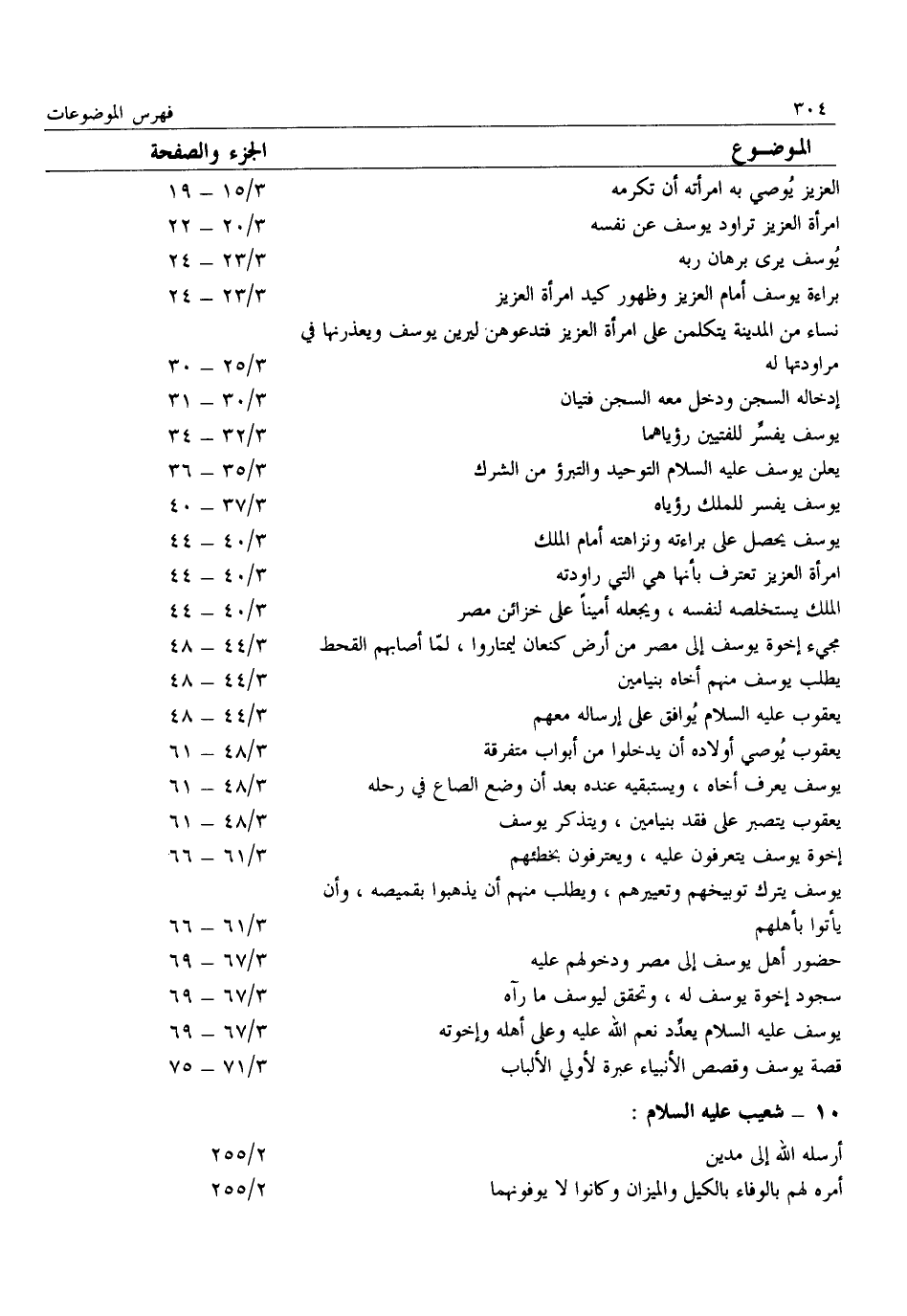 العزيز يوصي به امرأته أن تكرمه 3/ 15- 19 امرأة العزيز تراود يوسف عن نفسه 3/ 20- 22 يوسف يرى برهان ربه 3/ 23- 24 براءة يوسف أمام العزيز وظهور كيد امرأة العزيز 3/ 23- 24 نساء من المدينة يتكلمن على امرأة العزيز فتدعوهن ليرين يوسف ويعذرنها في مراودتها له 3/ 25- 30 إدخاله السجن ودخل معه السجن فتيان 3/ 30- 31 يوسف يفسّر للفتيين رؤياهما 3/ 32- 34 يعلن يوسف عليه السلام التوحيد والتبرؤ من الشرك 3/ 35- 36 يوسف يفسر للملك رؤياه 3/ 37- 40 يوسف يحصل على براءته ونزاهته أمام الملك 3/ 40- 44 امرأة العزيز تعترف بأنها هي التي راودته 3/ 40- 44 الملك يستخلصه لنفسه، ويجعله أمينا على خزائن مصر 3/ 40- 44 مجيء إخوة يوسف إِلَى مِصْرَ مِنْ أَرْضِ كَنْعَانَ لِيَمْتَارُوا، لَمَّا أصابهم القحط 3/ 44- 48 يطلب يوسف منهم أخاه بنيامين 3/ 44- 48 يعقوب عليه السلام يوافق على إرساله معهم 3/ 44- 48 يعقوب يوصي أولاده أن يدخلوا من أبواب متفرقة 3/ 48- 61 يوسف يعرف أخاه، ويستبقيه عنده بعد أن وضع الصاع في رحله 3/ 48- 61 يعقوب يتصبر على فقد بنيامين، ويتذكر يوسف 3/ 48- 61 إخوة يوسف يتعرفون عليه، ويعترفون بخطئهم 3/ 61- 66 يوسف يترك توبيخهم وتعييرهم، ويطلب منهم أن يذهبوا بقميصه، وأن يأتوا بأهلهم 3/ 61- 66 حضور أهل يوسف إلى مصر ودخولهم عليه 3/ 67- 69 سجود إخوة يوسف له، وتحقق ليوسف ما رآه 3/ 67- 69 يوسف عليه السلام يعدّد نعم الله عليه وعلى أهله وإخوته 3/ 67- 69 قصة يوسف وقصص الأنبياء عبرة لأولي الألباب 3/ 71- 75