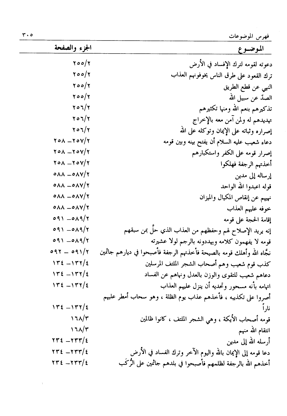 دعوته لقومه لترك الإفساد في الأرض 2/ 255 ترك القعود على طرق الناس يخوفونهم العذاب 2/ 255 النهي عن قطع الطريق 2/ 255 الصدّ عن سبيل الله 2/ 255 تذكيرهم بنعم الله ومنها تكثيرهم 2/ 256 تهديدهم له ولمن آمن معه بالإخراج 2/ 256 إصراره وثباته على الإيمان وتوكله على الله 2/ 256 دعاء شعيب عليه السلام أن يفتح بينه وبين قومه 2/ 257- 258 إصرار قومه على الكفر واستكبارهم 2/ 257- 258 أخذتهم الرجفة فهلكوا 2/ 257- 258 إرساله إلى مدين 2/ 587- 588 قوله اعبدوا الله الواحد 2/ 587- 588 نهيهم عن إنقاص المكيال والميزان 2/ 587- 588 خوفه عليهم العذاب 2/ 587- 588 إقامة الحجة على قومه 2/ 589- 591 إنه يريد الإصلاح لهم وحفظهم من العذاب الذي حلّ بمن سبقهم 2/ 589- 591 قومه لا يفهمون كلامه ويهددونه بالرجم لولا عشيرته 2/ 589- 591 نجّاه الله وأهلك قومه بالصيحة فأخذتهم الرجفة فأصبحوا في ديارهم جاثمين 2/ 591- 592 كذب قوم شعيب وهم أصحاب الشجر الملتف المرسلين 4/ 132- 134 دعاهم شعيب للتقوى والوزن بالعدل ونهاهم عن الفساد 4/ 132- 134 اتهامه بأنه مسحور وتحديه أن ينزل عليهم العذاب 4/ 132- 134 أصروا على تكذيبه، فأخذهم عذاب يوم الظلة، وهو سحاب أمطر عليهم نارا 4/ 132- 134 قومه أصحاب الأيكة، وهي الشجر الملتف، كانوا ظالمين 3/ 168 انتقام الله منهم 3/ 168 أرسله الله إلى مدين 4/ 233- 234 دعا قومه إلى الإيمان بالله واليوم الآخر وترك الفساد في الأرض 4/ 233- 234 أخذهم الله بالرجفة لظلمهم فأصبحوا في بلدهم جاثمين على الرّكب 4/ 233- 234