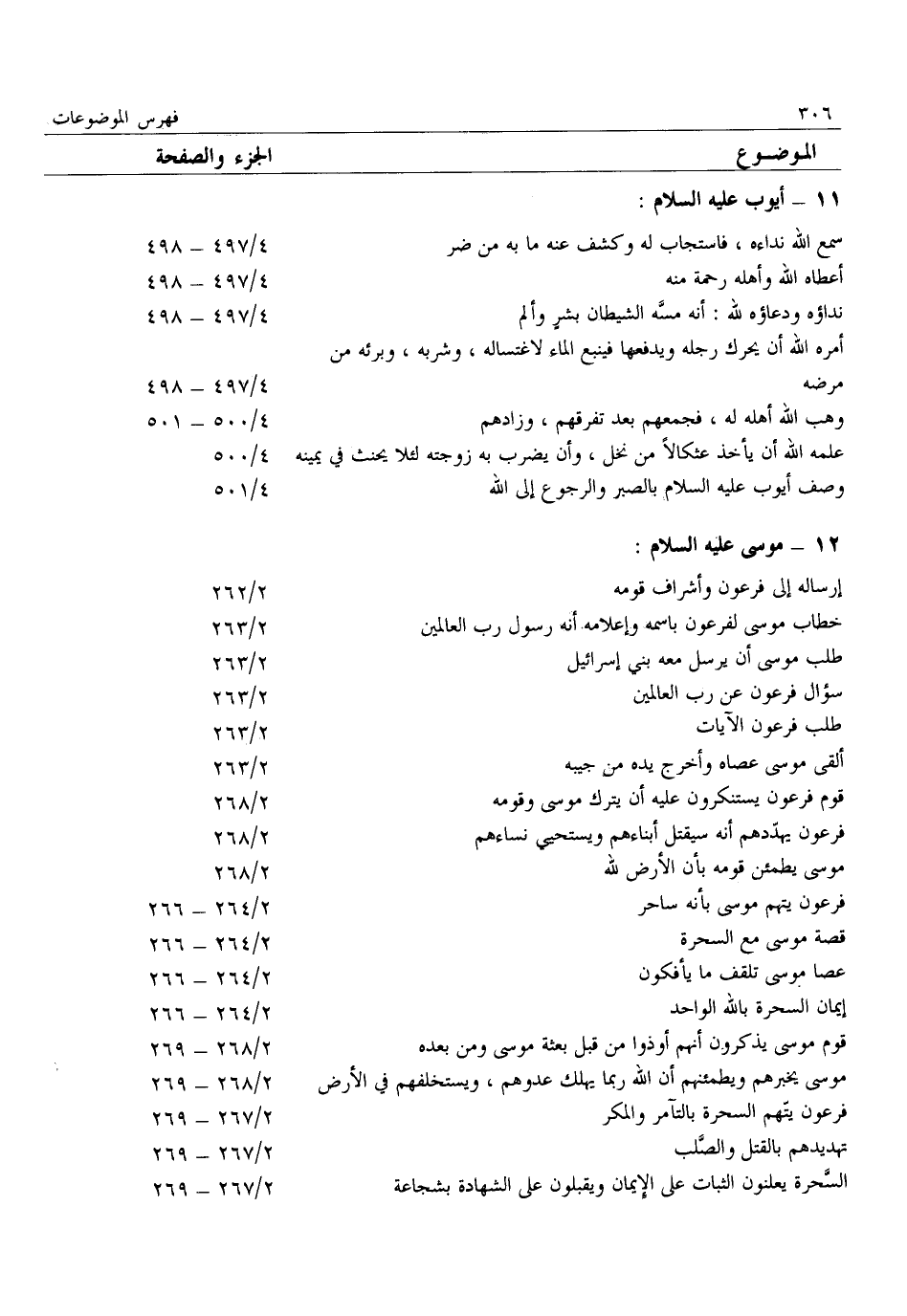 إرساله إلى فرعون وأشراف قومه 2/ 262 خطاب موسى لفرعون باسمه وإعلامه أنه رسول رب العالمين 2/ 263 طلب موسى أن يرسل معه بني إسرائيل 2/ 263 سؤال فرعون عن رب العالمين 2/ 263 طلب فرعون الآيات 2/ 263 ألقى موسى عصاه وأخرج يده من جيبه 2/ 263 قوم فرعون يستنكرون عليه أن يترك موسى وقومه 2/ 268 فرعون يهدّدهم أنه سيقتل أبناءهم ويستحيي نساءهم 2/ 268 موسى يطمئن قومه بأن الأرض لله 2/ 268 فرعون يتهم موسى بأنه ساحر 2/ 264- 266 قصة موسى مع السحرة 2/ 264- 266 عصا موسى تلقف ما يأفكون 2/ 264- 266 إيمان السحرة بالله الواحد 2/ 264- 266 قوم موسى يذكرون أنهم أوذوا من قبل بعثة موسى ومن بعده 2/ 268- 269 موسى يخبرهم ويطمئنهم أن الله ربما يهلك عدوهم، ويستخلفهم في الأرض 2/ 268- 269 فرعون يتّهم السحرة بالتآمر والمكر 2/ 267- 269 تهديدهم بالقتل والصّلب 2/ 267- 269 السّحرة يعلنون الثبات على الإيمان ويقبلون على الشهادة بشجاعة 2/ 267- 269