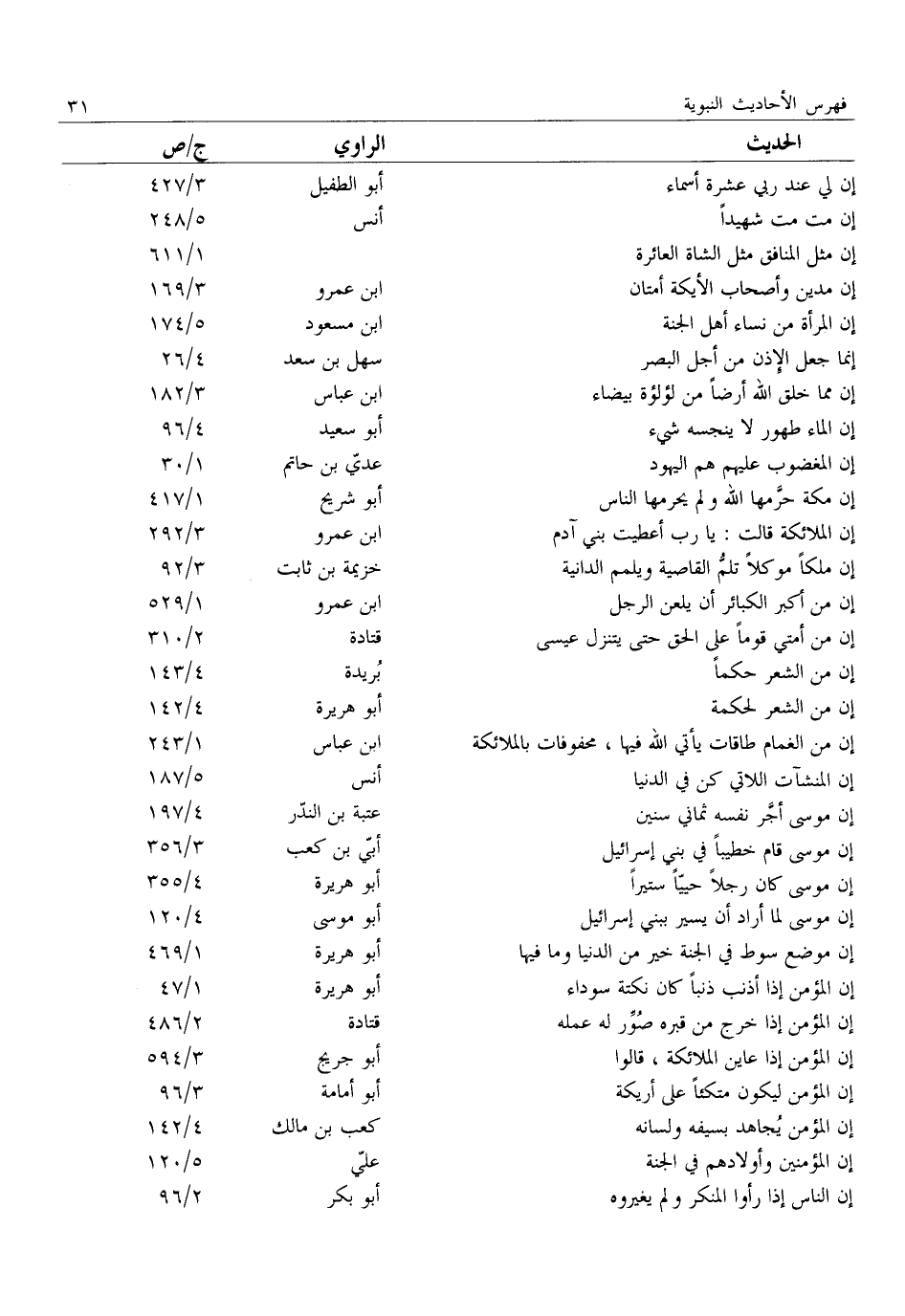 إن لي عند ربي عشرة أسماء: أبو الطفيل: 3/ 427 إن مت مت شهيدا: أنس: 5/ 248 إن مثل المنافق مثل الشاة العائرة:: 1/ 611 إن مدين وأصحاب الأيكة أمتان: ابن عمرو: 3/ 169 إن المرأة من نساء أهل الجنة: ابن مسعود: 5/ 174 إنما جعل الإذن من أجل البصر: سهل بن سعد: 4/ 26 إِنَّ مِمَّا خَلَقَ اللَّهُ أَرْضًا مِنْ لُؤْلُؤَةٍ بيضاء: ابن عباس: 3/ 182 إن الماء طهور لا ينجسه شيء: أبو سعيد: 4/ 96 إن المغضوب عليهم هم اليهود: عديّ بن حاتم: 1/ 30 إِنَّ مَكَّةَ حَرَّمَهَا اللَّهُ وَلَمْ يُحَرِّمْهَا النَّاسُ: أبو شريح: 1/ 417 إِنَّ الْمَلَائِكَةَ قَالَتْ: يَا رَبِّ أَعْطَيْتَ بَنِي آدم
