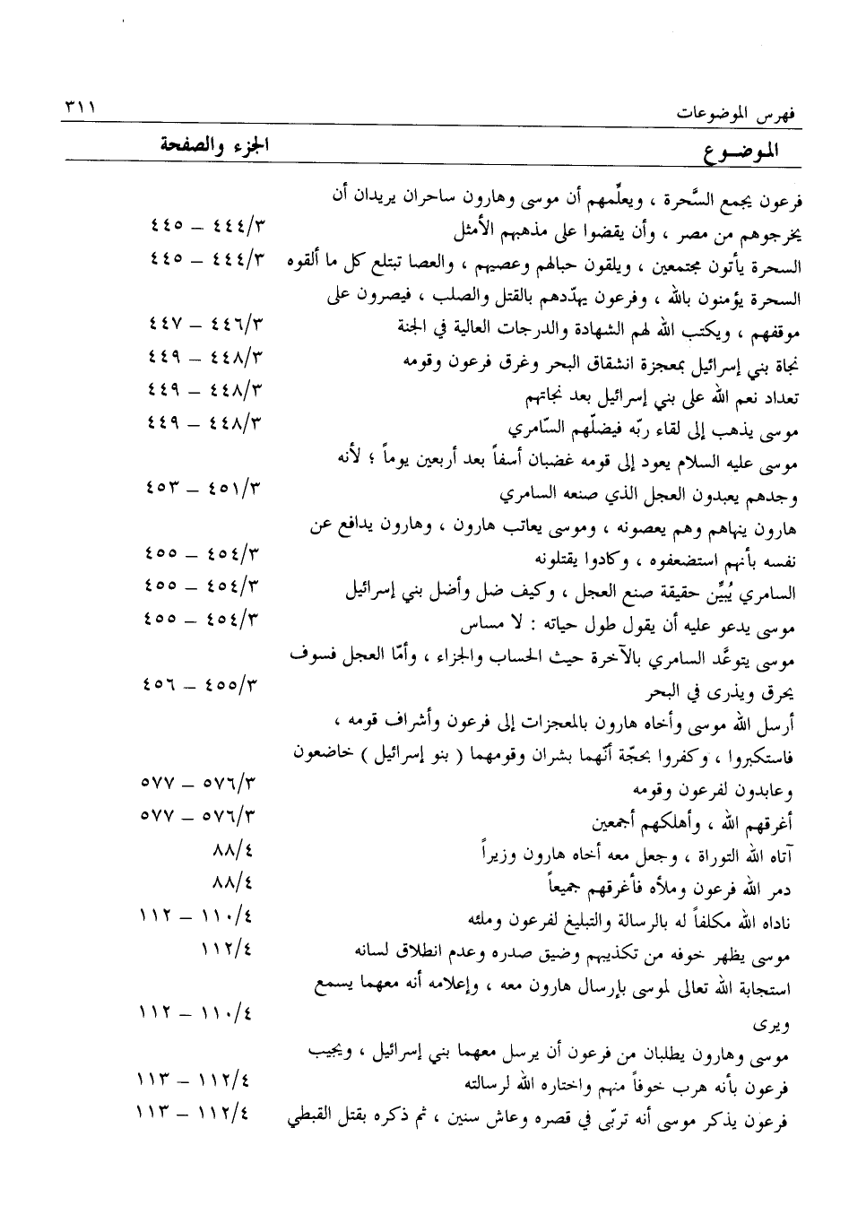 فرعون يجمع السّحرة، ويعلّمهم أن موسى وهارون ساحران يريدان أن يخرجوهم من مصر، وأن يقضوا على مذهبهم الأمثل 3/ 444- 445 السحرة يأتون مجتمعين، ويلقون حبالهم وعصيهم، والعصا تبتلع كل ما ألقوه 3/ 444- 445 السحرة يؤمنون بالله، وفرعون يهدّدهم بالقتل والصلب، فيصرون على موقفهم، ويكتب الله لهم الشهادة والدرجات العالية في الجنة 3/ 446- 447 نجاة بني إسرائيل بمعجزة انشقاق البحر وغرق فرعون وقومه 3/ 448- 449 تعداد نعم الله على بني إسرائيل بعد نجاتهم 3/ 448- 449 موسى يذهب إلى لقاء ربّه فيضلّهم السّامري 3/ 448- 449 موسى عليه السلام يعود إلى قومه غضبان أسفا بعد أربعين يوما لأنه وجدهم يعبدون العجل الذي صنعه السامري 3/ 451- 453 هارون ينهاهم وهم يعصونه، وموسى يعاتب هارون، وهارون يدافع عن نفسه بأنهم استضعفوه، وكادوا يقتلونه 3/ 454- 455 السامري يبيّن حقيقة صنع العجل، وكيف ضل وأضل بني إسرائيل 3/ 454- 455 موسى يدعو عليه أن يقول طول حياته: لا مساس 3/ 454- 455 موسى يتوعّد السامري بالآخرة حيث الحساب والجزاء، وأمّا العجل فسوف يحرق ويذرى في البحر 3/ 455- 456 أرسل الله موسى وأخاه هارون بالمعجزات إلى فرعون وأشراف قومه، فاستكبروا، وكفروا بحجّة أنّهما بشران وقومهما (بنو إسرائيل) خاضعون وعابدون لفرعون وقومه 3/ 576- 577 أغرقهم الله، وأهلكهم أجمعين 3/ 576- 577 آتاه الله التوراة، وجعل معه أخاه هارون وزيرا 4/ 88 دمر الله فرعون وملأه فأغرقهم جميعا 4/ 88 ناداه الله مكلفا له بالرسالة والتبليغ لفرعون وملئه 4/ 110- 112 موسى يظهر خوفه من تكذيبهم وضيق صدره وعدم انطلاق لسانه 4/ 112 استجابة الله تعالى لموسى بإرسال هارون معه، وإعلامه أنه معهما يسمع ويرى 4/ 110- 112 موسى وهارون يطلبان من فرعون أن يرسل معهما بني إسرائيل، ويجيب فرعون بأنه هرب خوفا منهم واختاره الله لرسالته 4/ 112- 113 فرعون يذكر موسى أنه تربّى في قصره وعاش سنين، ثم ذكره بقتل القبطي 4/ 112- 113