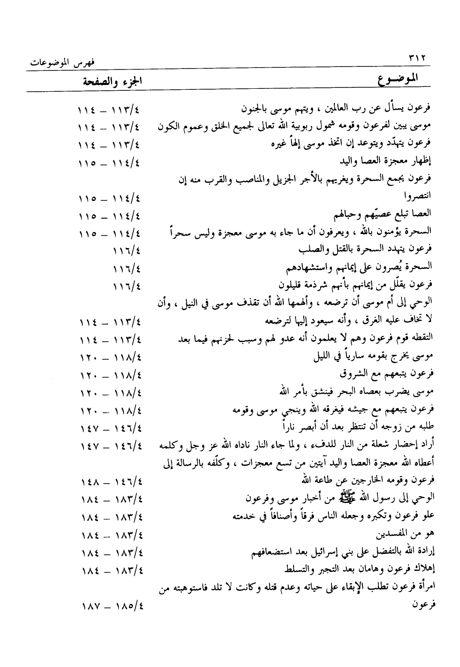 فرعون يسأل عن رب العالمين، ويتهم موسى بالجنون 4/ 113- 114 موسى يبين لفرعون وقومه شمول ربوبية الله تعالى لجميع الخلق وعموم الكون 4/ 113- 114 فرعون يتهدّد ويتوعد إن اتخذ موسى إلها غيره 4/ 113- 114 إظهار معجزة العصا واليد 4/ 114- 115 فرعون يجمع السحرة ويغريهم بالأجر الجزيل والمناصب والقرب منه إن انتصروا 4/ 114- 115 العصا تبلع عصيّهم وحبالهم 4/ 114- 115 السحرة يؤمنون بالله، ويعرفون أن ما جاء به موسى معجزة وليس سحرا 4/ 114- 115 فرعون يتهدد السحرة بالقتل والصلب 4/ 116 السحرة يصرون على إيمانهم واستشهادهم 4/ 116 فرعون يقلّل من إيمانهم بأنهم شرذمة قليلون 4/ 116 الوحي إلى أم موسى أن ترضعه، وألهمها الله أن تقذف موسى في النيل، وأن لا تخاف عليه الغرق، وأنه سيعود إليها لترضعه 4/ 113- 114 التقطه قوم فرعون وهم لا يعلمون أنه عدو لهم وسبب لحزنهم فيما بعد 4/ 113- 114 موسى يخرج بقومه ساريا في الليل 4/ 118- 120 فرعون يتبعهم مع الشروق 4/ 118- 120 موسى يضرب بعصاه البحر فينشق بأمر الله 4/ 118- 120 فرعون يتبعهم مع جيشه فيغرقه الله وينجي موسى وقومه 4/ 118- 120 طلبه من زوجه أن تنتظر بعد أن أبصر نارا 4/ 146- 147 أراد إحضار شعلة من النار للدفء، ولما جاء النار ناداه الله عز وجل وكلمه 4/ 146- 147 أعطاه الله معجزة العصا واليد آيتين من تسع معجزات، وكلّفه بالرسالة إلى فرعون وقومه الخارجين عن طاعة الله 4/ 146- 148 الوحي إِلَى رَسُولِ اللَّهِ صَلَّى اللَّهُ عَلَيْهِ وَسَلَّمَ من أخبار موسى وفرعون 4/ 183- 184 علو فرعون وتكبره وجعله الناس فرقا وأصنافا في خدمته 4/ 183- 184 هو من المفسدين 4/ 183- 184 إرادة الله بالتفضل على بني إسرائيل بعد استضعافهم 4/ 183- 184 إهلاك فرعون وهامان بعد التجبر والتسلط 4/ 183- 184 امرأة فرعون تطلب الإبقاء على حياته وعدم قتله وكانت لا تلد فاستوهبته من فرعون 4/ 185- 187