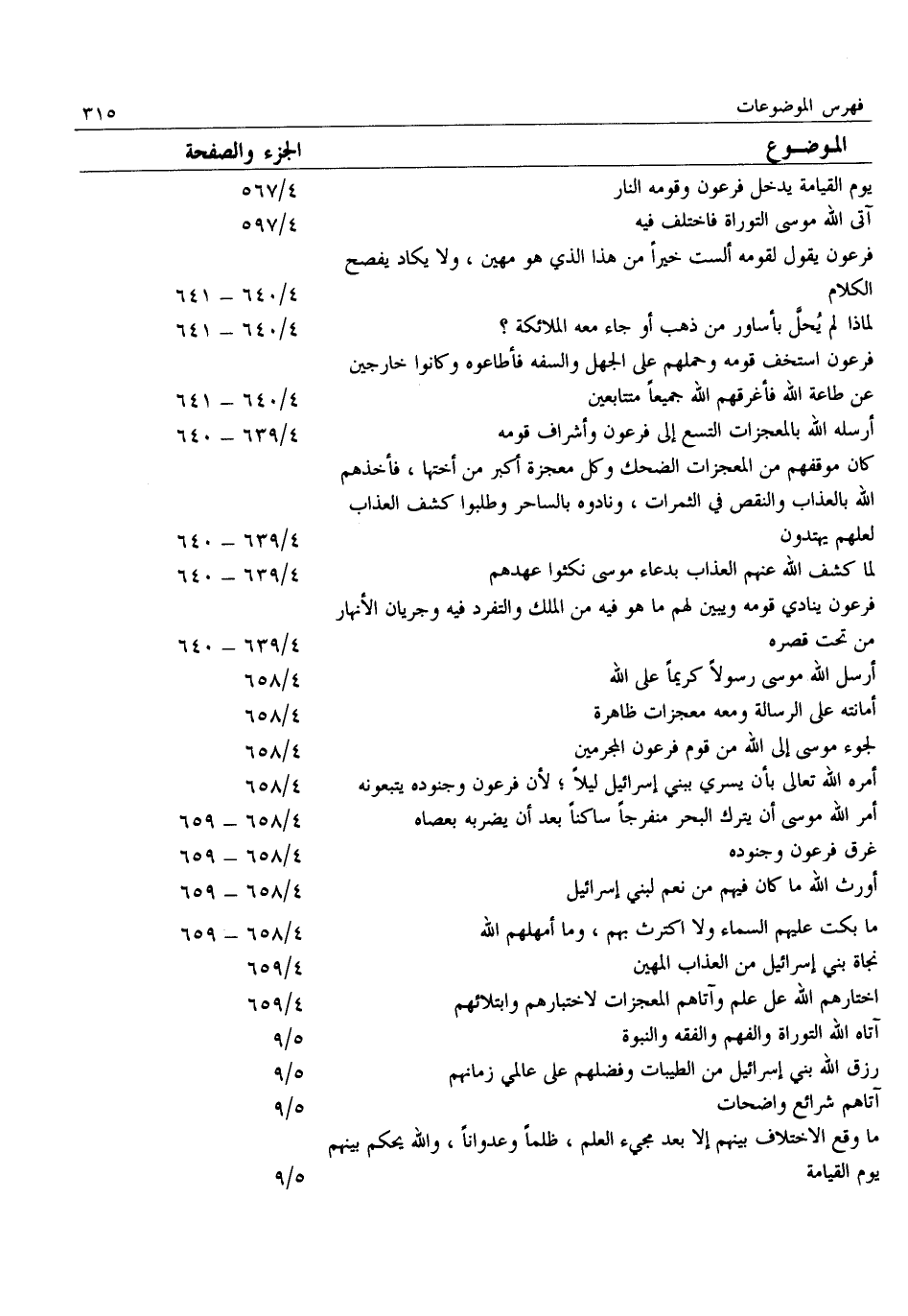 يوم القيامة يدخل فرعون وقومه النار 4/ 567 آتى الله موسى التوراة فاختلف فيه 4/ 597 فرعون يقول لقومه أَلَسْتُ خَيْرًا مِنْ هَذَا الَّذِي هُوَ مَهِينٌ، ولا يكاد يفصح الكلام 4/ 640- 641لماذا لم يحلّ بأساور من ذهب أو جاء معه الملائكة؟ 4/ 640- 641 فرعون استخف قومه وحملهم على الجهل والسفه فأطاعوه وكانوا خارجين عن طاعة الله فأغرقهم الله جميعا متتابعين 4/ 640- 641 أرسله الله بالمعجزات التسع إلى فرعون وأشراف قومه 4/ 639- 640 كان موقفهم من المعجزات الضحك وكل معجزة أكبر من أختها، فأخذهم الله بالعذاب والنقص في الثمرات، ونادوه بالساحر وطلبوا كشف العذاب لعلهم يهتدون 4/ 639- 640 لما كشف الله عنهم العذاب بدعاء موسى نكثوا عهدهم 4/ 639- 640 فرعون ينادي قومه ويبين لهم ما هو فيه من الملك والتفرد فيه وجريان الأنهار من تحت قصره 4/ 639- 640 أرسل الله موسى رسولا كريما على الله 4/ 658 أمانته على الرسالة ومعه معجزات ظاهرة 4/ 658 لجوء موسى إلى الله من قوم فرعون المجرمين 4/ 658 أمره الله تعالى بأن يسري ببني إسرائيل ليلا لأن فرعون وجنوده يتبعونه 4/ 658 أمره الله موسى أن يترك البحر منفرجا ساكنا بعد أن يضربه بعصاه 4/ 658- 659 غرق فرعون وجنوده 4/ 658- 659 أورث الله ما كان فيهم من نعم لبني إسرائيل 4/ 658- 659 ما بكت عليهم السماء ولا اكترث بهم، وما أمهلهم الله 4/ 658- 659 نجاة بني إسرائيل