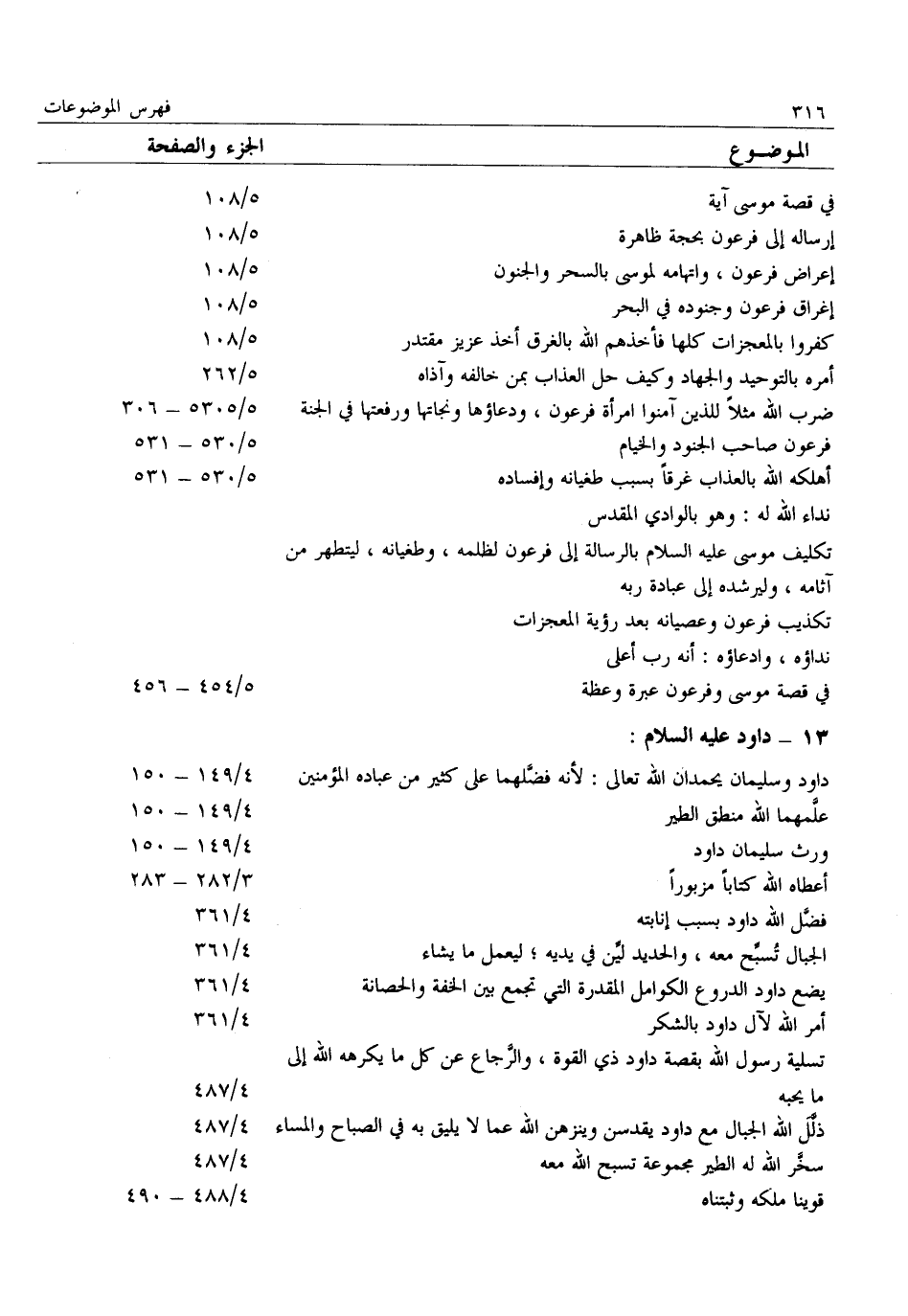 في قصة موسى آية 5/ 108 إرساله إلى فرعون بحجة ظاهرة 5/ 108 إعراض فرعون، واتهامه لموسى بالسحر والجنون 5/ 108 إغراق فرعون وجنوده في البحر 5/ 108 كفروا بالمعجزات كلها فأخذهم الله بالغرق أخذ عزيز مقتدر 5/ 108 أمره بالتوحيد والجهاد وكيف حل العذاب بمن خالفه وآذاه 5/ 262 ضرب الله مثلا للذين آمنوا امرأة فرعون، ودعاؤها ونجاتها ورفعتها في الجنة 5/ 5305- 306 فرعون صاحب الجنود والخيام 5/ 530- 531 أهلكه الله بالعذاب غرقا بسبب طغيانه وإفساده 5/ 530- 531 نداء الله له: وهو بالوادي المقدس تكليف موسى عليه السلام بالرسالة إلى فرعون لظلمه، وطغيانه، ليتطهر من آثامه، وليرشده إلى عبادة ربه تكذيب فرعون وعصيانه بعد رؤية المعجزات نداؤه، وادعاؤه: أنه رب أعلى في قصة موسى وفرعون عبرة وعظة 5/ 454- 456