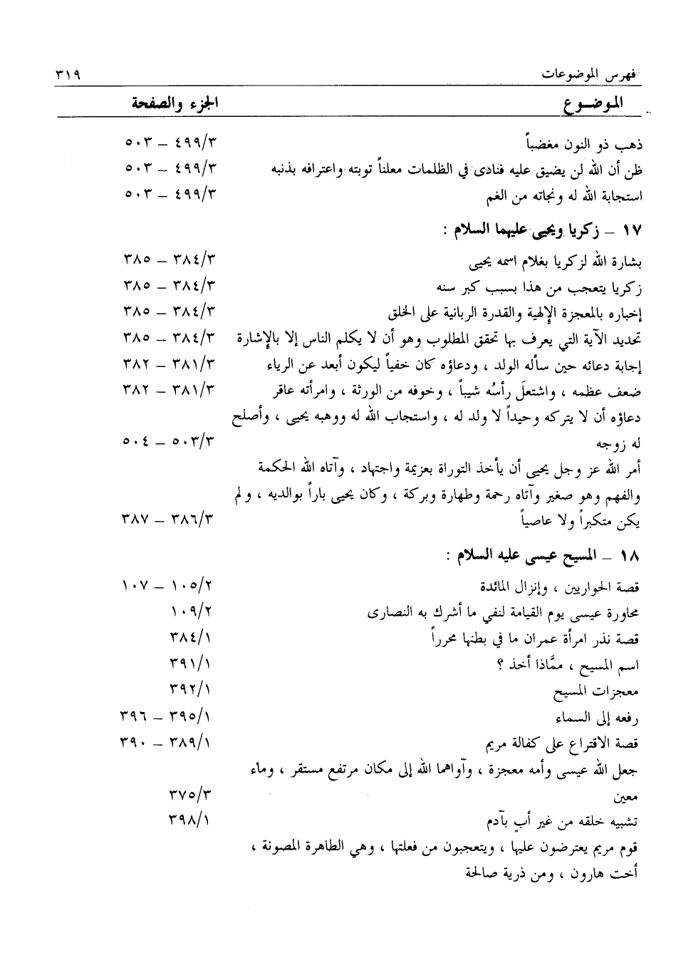 قصة الحواريين، وإنزال المائدة 2/ 105- 107 محاورة عيسى يوم القيامة لنفي ما أشرك به النصارى 2/ 109 قصة نذر امرأة عمران ما في بطنها محررا 1/ 384 اسم المسيح، ممّا ذا أخذ؟ 1/ 391 معجزات المسيح 1/ 392 رفعه إلى السماء 1/ 395- 396 قصة الاقتراع على كفالة مريم 1/ 389- 390 جعل الله عيسى وأمه معجزة، وآواهما الله إلى مكان مرتفع مستقر، وماء معين 3/ 375 تشبيه خلقه من غير أب بآدم 1/ 398 قوم مريم يعترضون عليها، ويتعجبون من فعلتها، وهي الطاهرة المصونة، أخت هارون، ومن ذرية صالحة
