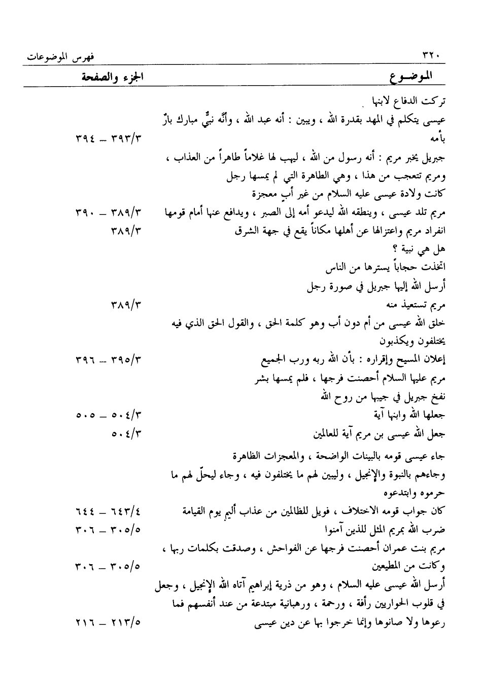 تركت الدفاع لابنها عيسى يتكلم في المهد بقدرة الله، ويبين: أنه عبد الله، وأنّه نبيّ مبارك بار بأمه 3/ 393- 394 جبريل يخبر مريم: أنه رسول من الله، ليهب لها غلاما طاهرا من العذاب، ومريم تتعجب من هذا، وهي الطاهرة التي لم يمسها رجل كانت ولادة عيسى عليه السلام من غير أب معجزة مريم تلد عيسى، وينطقه الله ليدعو أمه إلى الصبر، ويدافع عنها أمام قومها 3/ 389- 390 انفراد مريم واعتزالها عن أهلها مكانا يقع في جهة الشرق 3/ 389 هل هي نبية؟
