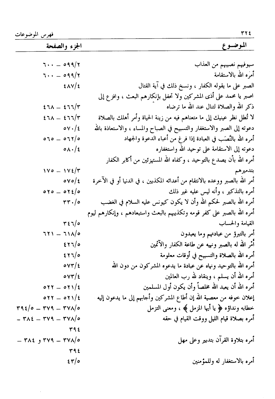 سيوفيهم نصيبهم من العذاب 2/ 599- 600 أمره الله بالاستقامة 2/ 599- 600 الصبر على ما يقوله الكفار، ونسخ ذلك في آية القتال 4/ 487 اصبر يا محمد على أذى المشركين ولا تحفل بإنكارهم البعث، وأفزع إلى ذكر الله والصلاة لتنال عند الله ما ترضاه 3/ 466- 468 لا تطل نظر عينيك إلى ما متعناهم فيه من زينة الحياة وأمر أهلك بالصلاة 3/ 466- 468 دعوته إلى الصبر والاستغفار والتسبيح في الصباح والمساء، والاستعاذة بالله 4/ 570 أمره الله بالنّصب في العبادة إذا فرغ من أعباء الدعوة والجهاد 5/ 562- 565 دعوته إلى الاستقامة على توحيد الله واستغفاره 4/ 580 أمره الله بأن يصدع بالتوحيد، وكفاه الله المستهزئين من أكابر الكفار بتدميرهم 3/ 174- 175 أمر الله بالصبر ووعده بالانتقام من أعدائه المكذبين، في الدنيا أو في الآخرة 4/ 575 أمره بالتذكير، وأنه ليس عليه غير ذلك 5/ 524- 525 أمره الله بالصبر لحكم الله وأن لا يكون كيونس عليه السلام في الغضب 5/ 330 أمره الله بالصبر على كفر قومه وتكذيبهم بالبعث واستبعادهم، وإنكارهم ليوم القيامة والحساب 5/ 346 أمر بالتبرؤ من عبادتهم وما يعبدون 5/ 618- 621 أمر الله له بالصبر ونهيه عن طاعة الكفار والآثمين 5/ 426 أمره الله بالصلاة والتسبيح في أوقات معلومة 5/ 426 أمره الله بالتوحيد ونهاه عن عبادة ما يدعوه المشركون من دون الله 4/ 573 أمره الله أن يسلم، وينقاد لله رب العالمين 4/ 573 أمره الله أن يعبد الله مخلصا وأن يكون أول المسلمين 4/ 521- 522 إعلان خوفه من معصية الله إن أطاع المشركين وأجابهم إلى ما يدعون إليه 4/ 521- 522 خطابه ونداؤه يا أيها المزمل، ومعنى التزمل 5/ 378- 379- 5/ 394 أمره بصلاة قيام الليل ووقت القيام في حقه 5/ 378- 379- 384- 394 أمره بتلاوة القرآن بتدبير وعلى مهل 5/ 378- 379 و 384- 394 أمره بالاستغفار له وللمؤمنين 5/ 43