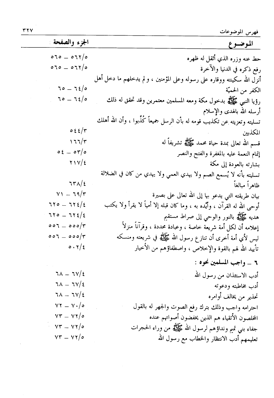 أدب الاستئذان من رسول الله 4/ 67- 68 أدب مخاطبته ودعوته 4/ 67- 68 تحذير من يخالف أوامره 4/ 67- 68 احترامه واجب وذلك بترك رفع الصوت والجهر له بالقول 5/ 70- 72 المخلصون الأتقياء هم الذين يخفضون أصواتهم عنده 5/ 72- 73 جفاء بني تميم ونداؤهم لِرَسُولِ اللَّهِ صَلَّى اللَّهُ عَلَيْهِ وَسَلَّمَ مِنَ وراء الحجرات 5/ 72- 73 تعليمهم أدب الانتظار والخطاب مع رسول الله 5/ 72- 73