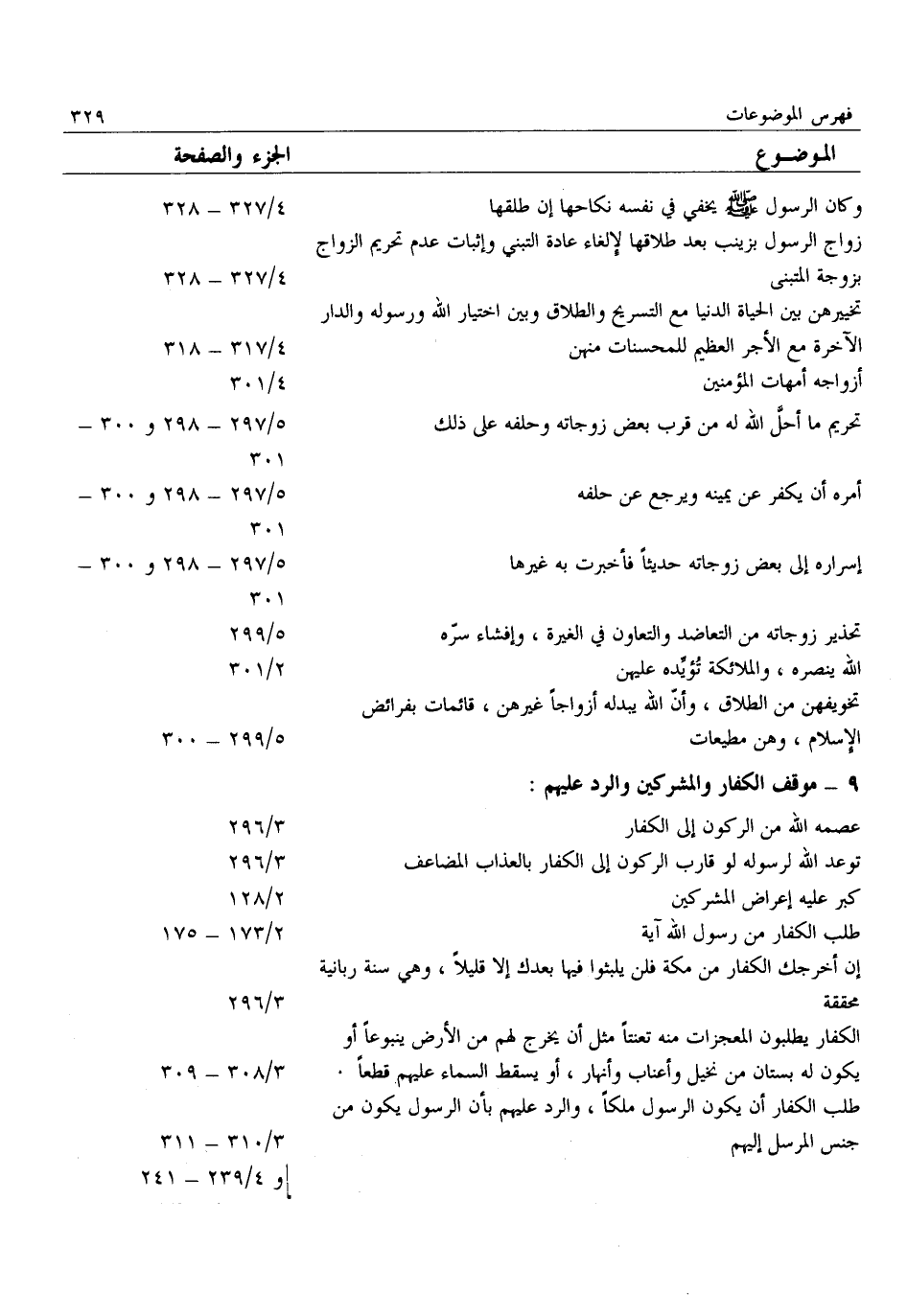 وكان الرسول صلّى الله عليه وسلم يخفي في نفسه نكاحها إن طلقها 4/ 327- 328 زواج الرسول بزينب بعد طلاقها لإلغاء عادة التبني وإثبات عدم تحريم الزواج بزوجة المتبنى 4/ 327- 328 تخييرهن بين الحياة الدنيا مع التسريح والطلاق وبين اختيار الله ورسوله والدار الآخرة مع الأجر العظيم للمحسنات منهن 4/ 317- 318 أزواجه أمهات المؤمنين 4/ 301 تحريم ما أحلّ الله له من قرب بعض زوجاته وحلفه على ذلك 5/ 297- 298 و 300- 301 أمره أن يكفر عن يمينه ويرجع عن حلفه 5/ 297- 298 و 300- 301 إسراره إلى بعض زوجاته حديثا فأخبرت به غيرها 5/ 297- 298 و 300- 301 تحذير زوجاته من التعاضد والتعاون في الغيرة، وإفشاء سرّه 5/ 299 الله ينصره، والملائكة تؤيّده عليهن 2/ 301 تخويفهن من الطلاق، وأنّ الله يبدله أزواجا غيرهن، قائمات بفرائض الإسلام، وهن مطيعات 5/ 299- 300