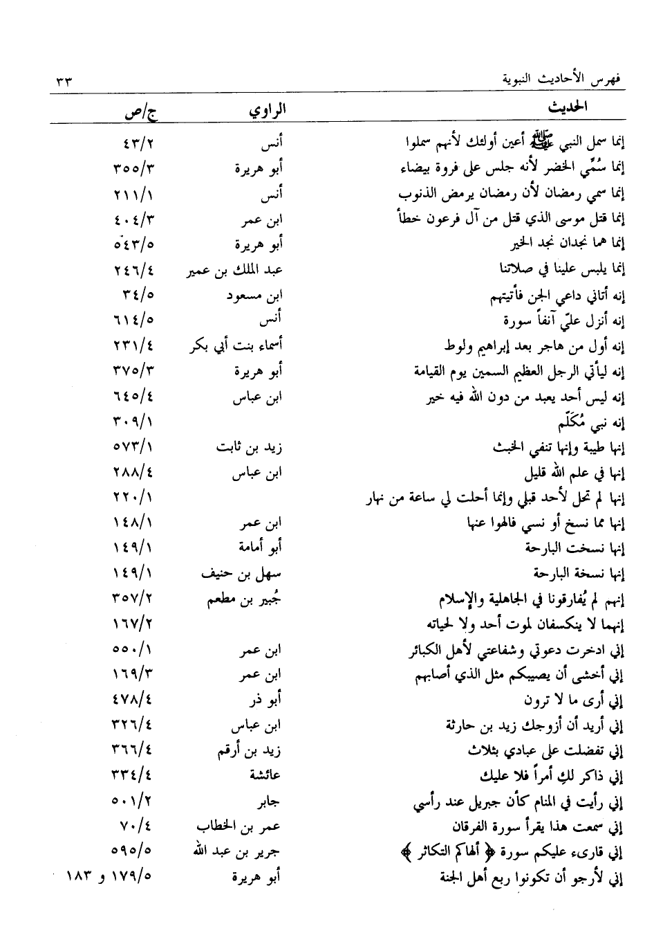 إنما سمل النبي صلّى الله عليه وسلم أعين أولئك لأنهم سملوا: أنس: 2/ 43 إِنَّمَا سُمِّيَ الْخَضِرُ لِأَنَّهُ جَلَسَ عَلَى فَرْوَةٍ بيضاء: أبو هريرة: 3/ 355 إِنَّمَا سُمِّيَ رَمَضَانَ لِأَنَّ رَمَضَانَ يَرْمِضُ الذُّنُوبَ: أنس: 1/ 211 إِنَّمَا قَتَلَ مُوسَى الَّذِي قَتَلَ مِنْ آلِ فرعون خطأ: ابن عمر: 3/ 404 إنما هما نجدان نجد الخير: أبو هريرة: 5/ 543 إنما يلبس علينا في صلاتنا: عبد الملك بن عمير: 4/ 246 إنه أتاني داعي الجن فأتيتهم: ابن مسعود: 5/ 34 إنه أنزل عليّ آنفا سورة: أنس: 5/ 614 إِنَّهُ أَوَّلُ مَنْ هَاجَرَ بَعْدَ إِبْرَاهِيمَ وَلُوطٍ: أسماء بنت أبي بكر: 4/ 231 إِنَّهُ لَيَأْتِي الرَّجُلُ الْعَظِيمُ السَّمِينُ يَوْمَ الْقِيَامَةِ: أبو هريرة: 3/ 375 إِنَّهُ لَيْسَ أَحَدٌ يُعْبَدُ مِنْ دُونِ اللَّهِ فيه خير: ابن عباس: 4/ 645 إنه نبي مكلّم:: 1/ 309 إنها طيبة وإنها تنفي الخبث: زيد بن ثابت: 1/ 573 إنها في علم الله قليل: ابن عباس: 4/ 288 إِنَّهَا لَمْ تَحِلَّ لِأَحَدٍ قَبْلِي وَإِنَّمَا أُحِلَّتْ لي ساعة من نهار:: 1/ 220 إِنَّهَا مِمَّا نُسِخَ أَوْ نُسِيَ فَالْهَوْا عَنْهَا: ابن عمر: 1/ 148 إنها نسخت البارحة: أبو أمامة: 1/ 149 إنها نسخت البارحة: سهل بن حنيف: 1/ 149 إنهم لم يفارقونا في الجاهلية والإسلام: جبير بن مطعم: 2/ 357 إِنَّهُمَا لَا يَنْكَسِفَانِ لِمَوْتِ أَحَدٍ وَلَا لِحَيَاتِهِ:: 2/ 167 إني ادخرت دعوتي وشفاعتي لأهل الكبائر: ابن عمر: 1/ 550 إِنِّي أَخْشَى أَنْ يُصِيبَكُمْ مِثْلُ الَّذِي أَصَابَهُمْ: ابن عمر: 3/ 169 إني أرى ما لا ترون: أبو ذر: 4/ 478 إِنِّي أُرِيدُ أَنْ أُزَوِّجَكِ زَيْدَ بْنَ حَارِثَةَ: ابن عباس: 4/ 326 إني تفضلت على عبادي بثلاث: زيد بن أرقم: 4/ 366 إني ذاكر لك أمرا فلا عليك: عائشة: 4/ 334 إِنِّي رَأَيْتُ فِي الْمَنَامِ كَأَنَّ جِبْرِيلَ عِنْدَ رأسي: جابر: 2/ 501 إني سمعت هذا يقرأ سورة الفرقان: عمر بن الخطاب: 4/ 70 إني قارئ عليكم سورة ألهاكم التكاثر: جرير بن عبد الله: 5/ 595 إِنِّي لِأَرْجُوَ أَنْ تَكُونُوا رُبُعَ أَهْلِ الْجَنَّةِ: أبو هريرة: 5/ 179 و 183