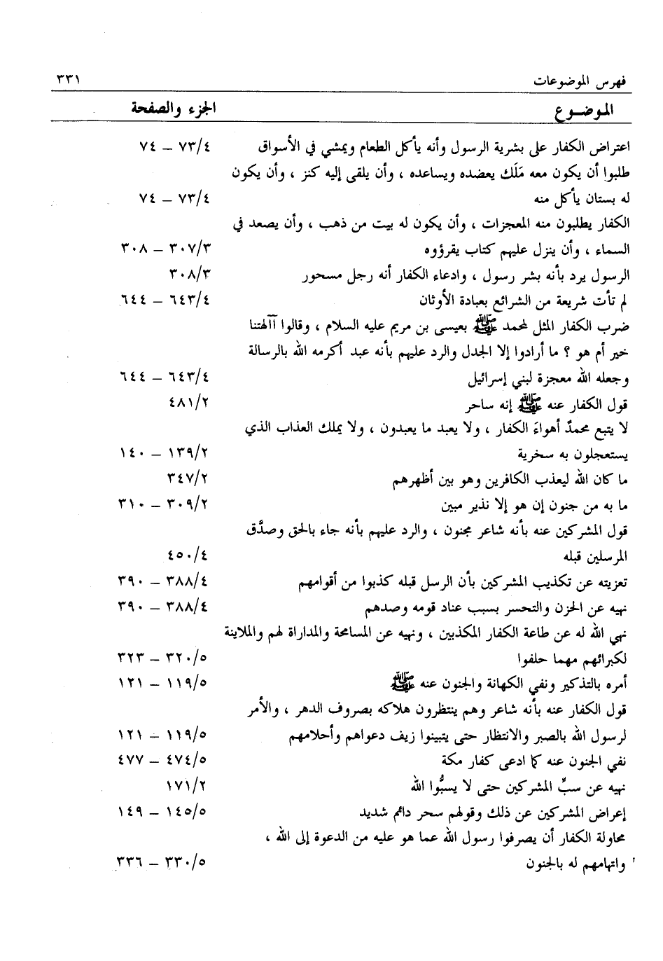 اعتراض الكفار على بشرية الرسول وأنه يأكل الطعام ويمشي في الأسواق 4/ 73- 74 طلبوا أن يكون معه ملك يعضده ويساعده، وأن يلقى إليه كنز، وأن يكون له بستان يأكل منه 4/ 73- 74 الكفار يطلبون منه المعجزات، وأن يكون له بيت من ذهب، وأن يصعد في السماء، وأن ينزل عليهم كتاب يقرءوه 3/ 307- 308 الرسول يرد بأنه بشر رسول، وادعاء الكفار أنه رجل مسحور 3/ 308 لم تأت شريعة من الشرائع بعبادة الأوثان 4/ 643- 644 ضرب الكفار المثل لمحمد صلّى الله عليه وسلم بعيسى بن مريم عليه السلام، وقالوا أآلهتنا خير أم هو؟ ما أرادوا إلا الجدل والرد عليهم بأنه عبد أكرمه الله بالرسالة وجعله الله معجزة لبني إسرائيل 4/ 643- 644 قول الكفار عنه صلّى الله عليه وسلم إنه ساحر 2/ 481 لا يتبع محمد أهواء الكفار، ولا يعبد ما يعبدون، ولا يملك العذاب الذي يستعجلون به سخرية 2/ 139- 140 ما كان الله ليعذب الكافرين وهو بين أظهرهم 2/ 347 ما به من جنون إن هو إلا نذير مبين 2/ 309- 310 قول المشركين عنه بأنه شاعر مجنون، والرد عليهم بأنه جاء بالحق وصدّق المرسلين قبله 4/ 450 تعزيته عن تكذيب المشركين بأن الرسل قبله كذبوا من أقوامهم 4/ 388- 390 نهيه عن الحزن والتحسر بسبب عناد قومه وصدهم 4/ 388- 390 نهي الله له عن طاعة الكفار المكذبين، ونهيه عن المسامحة والمداراة لهم والملاينة لكبرائهم مهما حلفوا 5/ 320- 323 أمره بالتذكير ونفي الكهانة والجنون عنه صلّى الله عليه وسلم 5/ 119- 121 قول الكفار عنه بأنه شاعر وهم ينتظرون هلاكه بصروف الدهر، والأمر لرسول الله بالصبر والانتظار حتى يتبينوا زيف دعواهم وأحلامهم 5/ 119- 121 نفي الجنون عنه كما ادعى كفار مكة 5/ 474- 477 نهيه عن سبّ المشركين حتى لا يسبّوا الله 2/ 171 إعراض المشركين عن ذلك وقولهم سحر دائم شديد 5/ 145- 149 محاولة الكفار أن يصرفوا رسول الله عما هو عليه من الدعوة إلى الله، واتهامهم له بالجنون 5/ 330- 336
