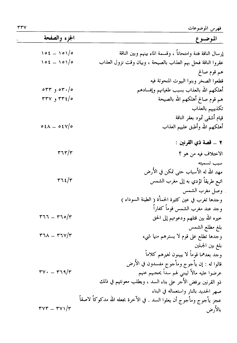الاختلاف فيه من هو؟ 3/ 363 سبب تسميته مهد الله له الأسباب حتى تمكن في الأرض اتبع طريقا تؤدي به إلى مغرب الشمس 3/ 364 وصل مغرب الشمس وجدها تغرب في عين كثيرة الحمأة (الطينة السوداء) وجد عند مغرب الشمس قوما كفارا خيره الله بين قتلهم ودعوتهم إلى الحق 3/ 365- 366 بَلَغَ مَطْلِعَ الشَّمْسِ وَجَدَهَا تَطْلُعُ عَلَى قَوْمٍ لا يسترهم منها شيء 3/ 367- 368 بلغ بين الجبلين وجد بعدهما قوما لا يبينون لغيرهم كلاما قالوا له: إن يأجوج ومأجوج مفسدون في الأرض عرضوا عليه مالا ليبني لهم سدا يحجبهم عنهم 3/ 369- 370 ذو القرنين يرفض الأجر على بناء السد، ويطلب معونتهم في ذلك صهر الحديد بالنار واستعماله في البناء عجز يأجوج ومأجوج أن يعلوا السد. في الآخرة بجعله الله مدكوكا لاصقا بالأرض 3/ 371- 373