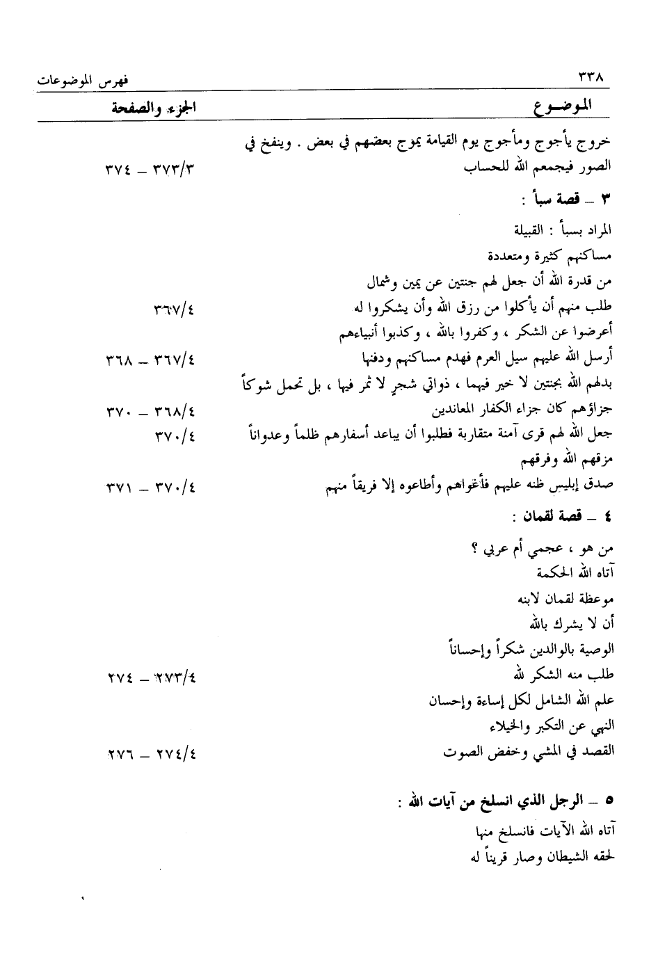 المراد بسبإ: القبيلة مساكنهم كثيرة ومتعددة من قدرة الله أن جعل لهم جنتين عن يمين وشمال طلب منهم أن يأكلوا من رزق الله وأن يشكروا له 4/ 367 أعرضوا عن الشكر، وكفروا بالله، وكذبوا أنبياءهم أرسل الله عليهم سيل العرم فهدم مساكنهم ودفنها 4/ 367- 368 بدلهم الله بجنتين لا خير فيهما، ذواتي شجر لا ثمر فيها، بل تحمل شوكا جزاؤهم كان جزاء الكفار المعاندين 4/ 368- 370 جعل الله لهم قرى آمنة متقاربة فطلبوا أن يباعد أسفارهم ظلما وعدوانا 4/ 370 مزقهم الله وفرقهم صدق إبليس ظنه عليهم فأغواهم وأطاعوه إلا فريقا منهم 4/ 370- 371