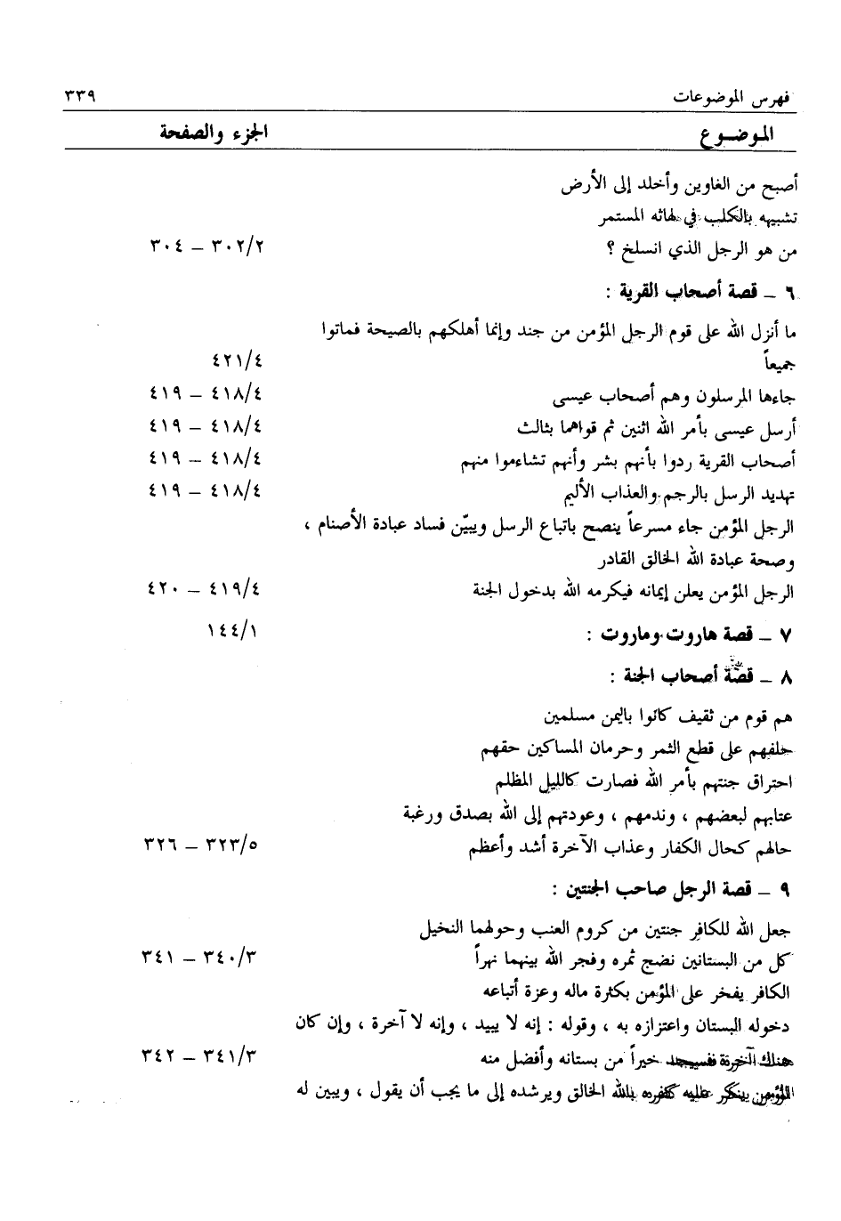 جعل الله للكافر جنتين من كروم العنب وحولهما النخيل كل من البستانين نضج ثمره وفجر الله بينهما نهرا 3/ 340- 341 الكافر يفخر على المؤمن بكثرة ماله وعزة أتباعه دخوله البستان واعتزازه به، وقوله: إنه لا يبيد، وإنه لا آخرة، وإن كان هناك آخرة فسيجد خيرا من بستانه وأفضل منه 3/ 341- 342 المؤمن ينكر عليه كفره بالله الخالق ويرشده إلى ما يجب أن يقول، ويبين له