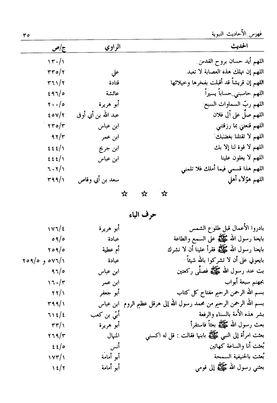 بادروا الأعمال قبل طلوع الشمس: أبو هريرة: 4/ 176 بَايَعْنَا رَسُولَ اللَّهِ صَلَّى اللَّهُ عَلَيْهِ وَسَلَّمَ عَلَى السمع والطاعة: عبادة: 5/ 59 بَايَعْنَا رَسُولَ اللَّهِ صَلَّى اللَّهُ عَلَيْهِ وَسَلَّمَ فَقَرَأَ علينا أن لا نشرك: أم عطية: 5/ 259 بَايِعُونِي عَلَى أَنْ لَا تُشْرِكُوا بِاللَّهِ شَيْئًا: عبادة: 1/ 576 و 5/ 259 بِتُّ عِنْدَ رَسُولِ اللَّهِ صَلَّى اللَّهُ عَلَيْهِ وَسَلَّمَ فصلّى ركعتين: ابن عباس: 5/ 96 بجهنم سبعة أبواب: ابن عمر: 3/ 160 بِسْمِ اللَّهِ الرَّحْمَنِ الرَّحِيمِ مِفْتَاحُ كُلِّ كِتَابٍ: أبو جعفر: 1/ 22 بِسْمِ اللَّهِ الرَّحْمَنِ الرَّحِيمِ مِنْ مُحَمَّدٍ رَسُولِ الله إلى هرقل عظيم الروم: ابن عباس: 1/ 399 بشر هذه الأمة بالسناء والرفعة: أبيّ بن كعب: 4/ 614 بُعِثَ رَسُولُ اللَّهِ صَلَّى اللَّهُ عَلَيْهِ وَسَلَّمَ بعثا فاستقرأ: أبو هريرة: 1/ 33 بَعَثَتِ امْرَأَةٌ إِلَى النَّبِيِّ صَلَّى اللَّهُ عَلَيْهِ وسلم بابنها فقالت: قل له اكسني: المنهال: 3/ 269 بعثت أنا والساعة كهاتين: أنس: 5/ 44 بعثت بالحنيفية السمحة: أبو أمامة: 1/ 173 بَعَثَنِي رَسُولُ اللَّهِ صَلَّى اللَّهُ عَلَيْهِ وَسَلَّمَ إِلَى قومي: أبو أمامة: 2/ 14