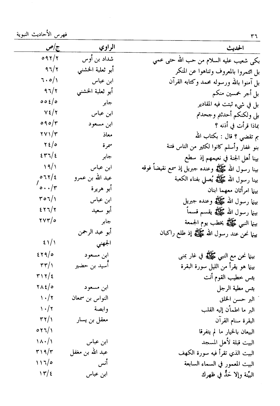 بَكَى شُعَيْبٌ عَلَيْهِ السَّلَامُ مِنْ حُبِّ اللَّهِ حتى عمي: شداد بن أوس: 2/ 592 بل ائتمروا بالمعروف وتناهوا عن المنكر: أبو ثعلبة الخشني: 2/ 96 بَلْ آمِنُوا بِاللَّهِ وَرَسُولِهِ مُحَمَّدٍ وَكِتَابِهِ الْقُرْآنَ: ابن عباس: 1/ 605 بل أجر خمسين منكم: أبو ثعلبة الخشني: 2/ 96 بل في شيء ثبتت فيه المقادير: جابر: 5/ 554 بلى ولكنكم أحدثتم وجحدتم: ابن عباس: 2/ 74بماذا قرأت في أذنه؟: ابن مسعود: 3/ 595 بم تقضي؟ قال: بكتاب الله: معاذ: 3/ 271 بَنُو غِفَارٍ وَأَسْلَمُ كَانُوا لِكَثِيرٍ مِنَ النَّاسِ فتنة: سمرة: 5/ 24 بَيْنَا أَهْلُ الْجَنَّةِ فِي نَعِيمِهِمْ إِذْ سَطَعَ: جابر: 4/ 436 بَيْنَا رَسُولُ اللَّهِ صَلَّى اللَّهُ عَلَيْهِ وَسَلَّمَ وَعِنْدَهُ جِبْرِيلُ إِذْ سَمِعَ نَقِيضًا فَوْقَهُ: ابن عباس: 1/ 19 بَيْنَا رَسُولُ اللَّهِ صَلَّى اللَّهُ عَلَيْهِ وَسَلَّمَ يُصَلِّي بفناء الكعبة: عبد الله بن عمرو: 4/ 562 بينما امرأتان معهما ابنان: أبو هريرة: 3/ 500 بَيْنَمَا رَسُولُ اللَّهِ صَلَّى اللَّهُ عَلَيْهِ وَسَلَّمَ وعنده جبريل: ابن عباس: 1/ 356 بَيْنَمَا رَسُولُ اللَّهِ صَلَّى اللَّهُ عَلَيْهِ وَسَلَّمَ يقسم قسما: أبو سعيد: 2/ 426 بَيْنَمَا النَّبِيُّ صَلَّى اللَّهُ عَلَيْهِ وَسَلَّمَ يَخْطُبُ يوم الجمعة: جابر: 5/ 273 بَيْنَمَا نَحْنُ عِنْدَ رَسُولِ اللَّهِ صَلَّى اللَّهُ عَلَيْهِ وَسَلَّمَ إِذْ طلع راكبان: أبو عبد الرحمن الجهني: 1/ 41 بَيْنَمَا نَحْنُ مَعَ النَّبِيِّ صَلَّى اللَّهُ عَلَيْهِ وَسَلَّمَ فِي غار بمنى: ابن مسعود: 5/ 429 بَيْنَمَا هُوَ يَقْرَأُ مِنَ اللَّيْلِ سُورَةَ الْبَقَرَةِ: أسيد بن حضير: 1/ 33 بئس خطيب القوم أنت:: 4/ 312 بئس مطية الرجل: ابن مسعود: 5/ 284 البر حسن الخلق: النواس بن سمعان: 2/ 10 البر ما اطمأن إليه القلب: وابصة: 2/ 10 البقرة سنام القرآن: معقل بن يسار: 1/ 32 البيعان بالخيار ما لم يتفرقا:: 1/ 526 البيت قبلة لأهل المسجد: ابن عباس: 1/ 180 البيت الذي تقرأ فيه سورة الكهف: عبد الله بن مغفل: 3/ 319 البيت المعمور في السماء السابعة: أنس: 5/ 116 البيّنة وإلا حدّ في ظهرك: ابن عباس: 4/ 13