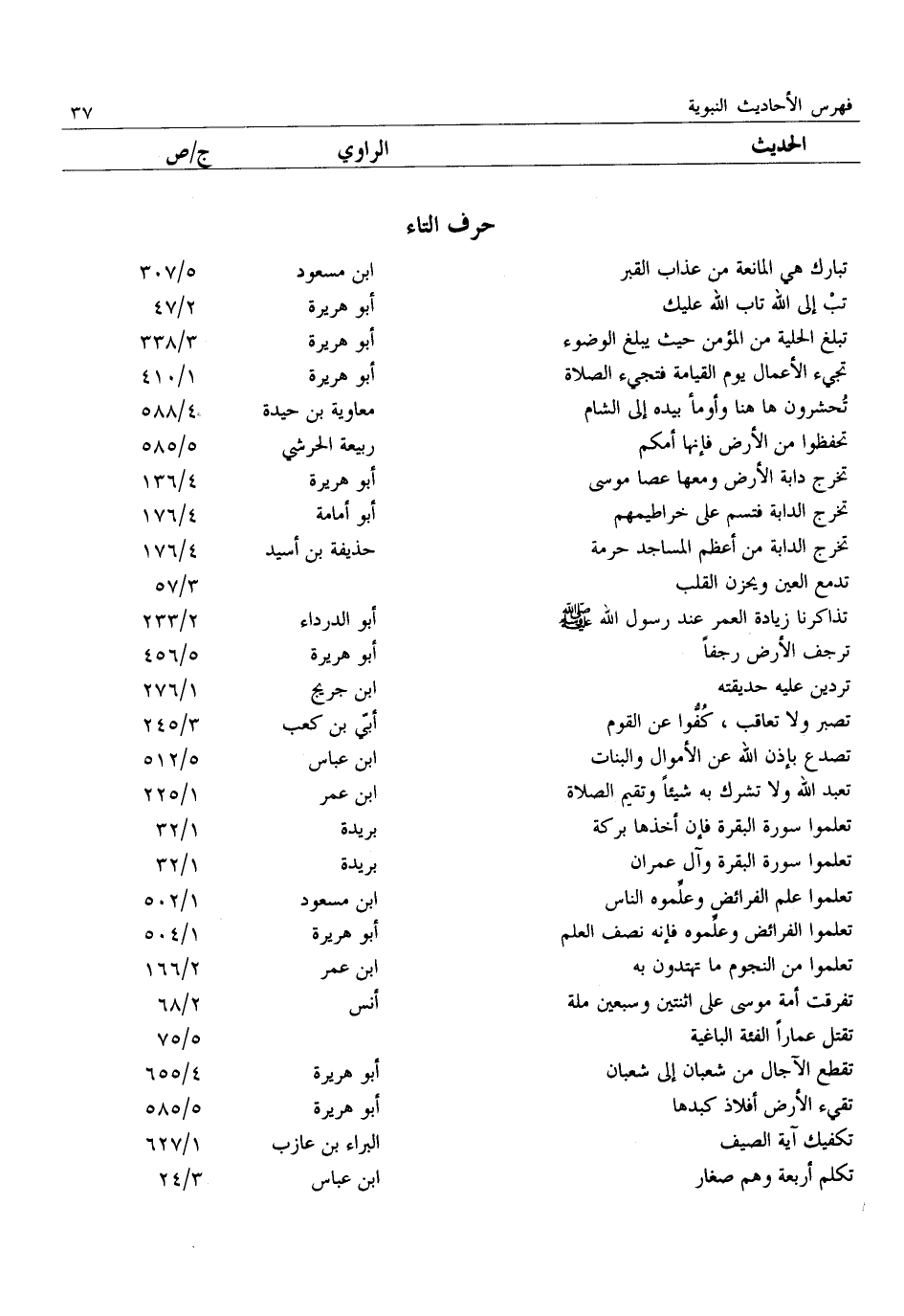 تبارك هي المانعة من عذاب القبر: ابن مسعود: 5/ 307 تب إلى الله تاب الله عليك: أبو هريرة: 2/ 47 تَبْلُغُ الْحِلْيَةُ مِنَ الْمُؤْمِنِ حَيْثُ يَبْلُغُ الْوُضُوءُ: أبو هريرة: 3/ 338 تجيء الأعمال يوم القيامة فتجيء الصلاة: أبو هريرة: 1/ 410 تحشرون ها هنا وأومأ بيده إلى الشام: معاوية بن حيدة: 4/ 588 تحفظوا من الأرض فإنها أمكم: ربيعة الحرشي: 5/ 585 تخرج دابة الأرض ومعها عصا موسى: أبو هريرة: 4/ 136 تخرج الدابة فتسم على خراطيمهم: أبو أمامة: 4/ 176 تخرج الدابة من أعظم المساجد حرمة: حذيفة بن أسيد: 4/ 176 تدمع العين ويحزن القلب:: 3/ 57 تَذَاكَرْنَا زِيَادَةَ الْعُمُرِ عِنْدَ رَسُولِ اللَّهِ صَلَّى اللَّهُ عَلَيْهِ وَسَلَّمَ: أبو الدرداء: 2/ 233 ترجف الأرض رجفا: أبو هريرة: 5/ 456 تردين عليه حديقته: ابن جريج: 1/ 276 تصبر ولا تعاقب، كفّوا عن القوم: أبيّ بن كعب: 3/ 245 تصدع بإذن الله عن الأموال والبنات: ابن عباس: 5/ 512 تَعْبُدُ اللَّهَ وَلَا تُشْرِكْ بِهِ شَيْئًا وَتُقِيمُ الصلاة: ابن عمر: 1/ 225 تعلموا سورة البقرة فإن أخذها بركة: بريدة: 1/ 32 تعلموا سورة البقرة وآل عمران: بريدة: 1/ 32 تعلموا علم الفرائض وعلّموه الناس: ابن مسعود: 1/ 502 تعلموا الفرائض وعلّموه فإنه نصف العلم: أبو هريرة: 1/ 504 تعلموا من النجوم ما تهتدون به: ابن عمر: 2/ 166 تَفَرَّقَتْ أُمَّةُ مُوسَى عَلَى اثْنَتَيْنِ وَسَبْعِينَ مِلَّةً: أنس: 2/ 68 تقتل عمارا الفئة الباغية:: 5/ 75 تقطع الآجال من شعبان إلى شعبان: أبو هريرة: 4/ 655 تقيء الأرض أفلاذ كبدها: أبو هريرة: 5/ 585 تكفيك آية الصيف: البراء بن عازب: 1/ 627 تكلم أربعة وهم صغار: ابن عباس: 3/ 24