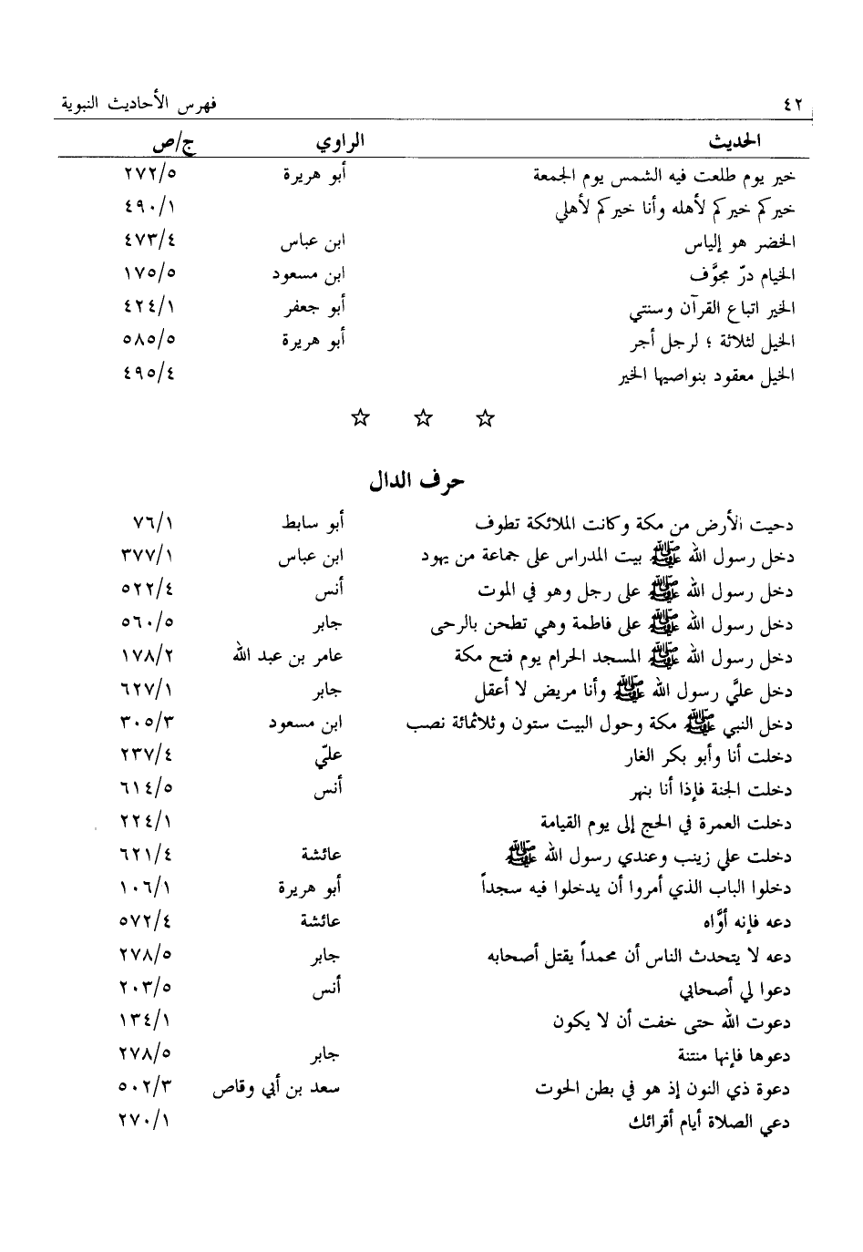 دُحِيَتِ الْأَرْضُ مِنْ مَكَّةَ وَكَانَتِ الْمَلَائِكَةُ تَطُوفُ: أبو سابط: 1/ 76 دَخَلَ رَسُولُ اللَّهِ صَلَّى اللَّهُ عَلَيْهِ وَسَلَّمَ بَيْتَ الْمِدْرَاسِ عَلَى جَمَاعَةٍ مِنْ يَهُودَ: ابن عباس: 1/ 377 دَخَلَ رَسُولَ اللَّهِ صَلَّى اللَّهُ عَلَيْهِ وَسَلَّمَ عَلَى رجل وهو في الموت: أنس: 4/ 522 دَخَلَ رَسُولَ اللَّهِ صَلَّى اللَّهُ عَلَيْهِ وَسَلَّمَ عَلَى فاطمة وهي تطحن بالرحى: جابر: 5/ 560 دَخَلَ رَسُولُ اللَّهِ صَلَّى اللَّهُ عَلَيْهِ وَسَلَّمَ الْمَسْجِدَ الحرام يوم فتح مكة: عامر بن عبد الله: 2/ 178 دَخَلَ عَلَى رَسُولِ اللَّهِ صَلَّى اللَّهُ عَلَيْهِ وَسَلَّمَ وأنا مريض لا أعقل: جابر: 1/ 627 دخل النبي صلّى الله عليه وَسَلَّمَ مَكَّةَ وَحَوْلَ الْبَيْتِ سِتُّونَ وَثَلَاثُمِائَةِ نُصْبٍ: ابن مسعود: 3/ 305 دخلت أنا وأبو بكر الغار: عليّ: 4/ 237 دخلت الجنة فإذا أنا بنهر: أنس: 5/ 614 دَخَلَتِ الْعُمْرَةُ فِي الْحَجِّ إِلَى يَوْمِ الْقِيَامَةِ:: 1/ 224 دَخَلَتْ عَلَيَّ زَيْنَبُ وَعِنْدِي رَسُولُ اللَّهِ صَلَّى الله عليه وسلم: عائشة: 4/ 621 دَخَلُوا الْبَابَ الَّذِي أُمِرُوا أَنْ يَدْخُلُوا فِيهِ سجدا: أبو هريرة: 1/ 106 دعه فإنه أوّاه: عائشة: 4/ 572 دَعْهُ لَا يَتَحَدَّثِ النَّاسُ أَنَّ مُحَمَّدًا يَقْتُلُ أصحابه: جابر: 5/ 278 دعوا لي أصحابي: أنس: 5/ 203 دَعَوْتُ اللَّهَ حَتَّى خِفْتُ أَنْ لَا يَكُونَ:: 1/ 134 دعوها فإنها منتنة: جابر: 5/ 278 دَعْوَةُ ذِي النُّونِ إِذْ هُوَ فِي بَطْنِ الحوت: سعد بن أبي وقاص: 3/ 502 دعي الصلاة أيام أقرائك:: 1/ 270