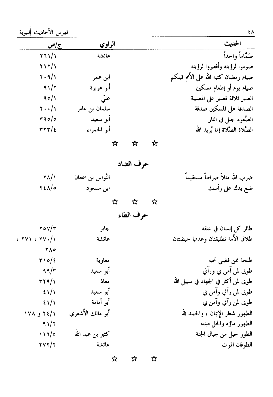 صماما واحدا: عائشة: 1/ 261 صوموا لرؤيته وأفطروا لرؤيته:: 1/ 212 صِيَامُ رَمَضَانَ كَتَبَهُ اللَّهُ عَلَى الْأُمَمِ قَبْلَكُمْ: ابن عمر: 1/ 209 صيام يوم أو إطعام مسكين: أبو هريرة: 2/ 91 الصبر ثلاثة فصبر على المصيبة: عليّ: 1/ 95 الصدقة على المسكين صدقة: سلمان بن عامر: 1/ 200 الصّعود جبل في النار: أبو سعيد: 5/ 395 الصّلاة الصّلاة إنما يريد الله: أبو الحمراء: 4/ 323