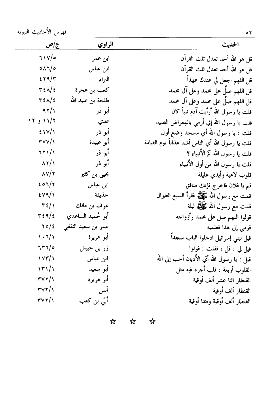 قُلْ هُوَ اللَّهُ أَحَدٌ تَعْدِلُ ثُلُثَ الْقُرْآنِ: ابن عمر: 5/ 617 قُلْ هُوَ اللَّهُ أَحَدٌ تَعْدِلُ ثُلُثَ الْقُرْآنِ: ابن عباس: 5/ 586 قل اللهم اجعل لي عندك عهدا: البراء: 3/ 429 قُلِ اللَّهُمَّ صِلِّ عَلَى مُحَمَّدٍ وَعَلَى آلِ محمد: كعب بن عجرة: 4/ 348 قُلِ اللَّهُمَّ صِلِّ عَلَى مُحَمَّدٍ وَعَلَى آلِ محمد: طلحة بن عبيد الله: 4/ 348 قُلْتُ يَا رَسُولَ اللَّهِ أَرَأَيْتَ آدَمَ نَبِيًّا كان: أبو ذر: 1/ 92 قَلْتُ يَا رَسُولَ اللَّهِ إِنِّي أَرْمِي بِالْمِعْرَاضِ الصيد: عدي: 2/ 11 و 12 قُلْتُ: يَا رَسُولَ اللَّهِ أَيُّ مَسْجِدٍ وُضِعَ أول: أبو ذر: 1/ 417 قُلْتُ يَا رَسُولَ اللَّهِ أَيُّ النَّاسِ أَشَدُّ عذابا يوم القيامة: أبو عبيدة: 1/ 377 قلت يا رسول الله كم الأنبياء؟: أبو ذر: 1/ 621 قُلْتُ يَا رَسُولَ اللَّهِ مَنْ أَوَّلُ الْأَنْبِيَاءِ: أبو ذر: 1/ 82 قلوب لاهية وأيدي عليلة: يحيى بن كثير: 2/ 87 قم يا فلان فاخرج فإنك منافق: ابن عباس: 2/ 456 قُمْتُ مَعَ رَسُولِ اللَّهِ صَلَّى اللَّهُ عَلَيْهِ وَسَلَّمَ فقرأ السبع الطوال: حذيفة: 1/ 479 قُمْتُ مَعَ رَسُولِ اللَّهِ صَلَّى اللَّهُ عَلَيْهِ وَسَلَّمَ ليلة: عوف بن مالك: 1/ 34 قولوا اللهم صل على محمد وأزواجه: أبو حميد الساعدي: 4/ 349 قومي إلى هذا فعلميه: عمر بن سعيد الثقفي: 4/ 25 قيل لبني إسرائيل ادخلوا الباب سجدا: أبو هريرة: 1/ 106 قيل لي: قل، فقلت: قولوا: زر بن حبيش: 5/ 636 قِيلَ: يَا رَسُولَ اللَّهِ أَيُّ الْأَدْيَانِ أَحَبُّ إلى الله: ابن عباس: 1/ 173 القلوب أربعة: قلب أجرد فيه مثل: أبو سعيد: 1/ 131 القنطار اثنا عشر ألف أوقية: أبو هريرة: 1/ 372 القنطار ألف أوقية: أنس: 1/ 372 القنطار ألف أوقية ومائتا أوقية: أبيّ بن كعب: 1/ 372