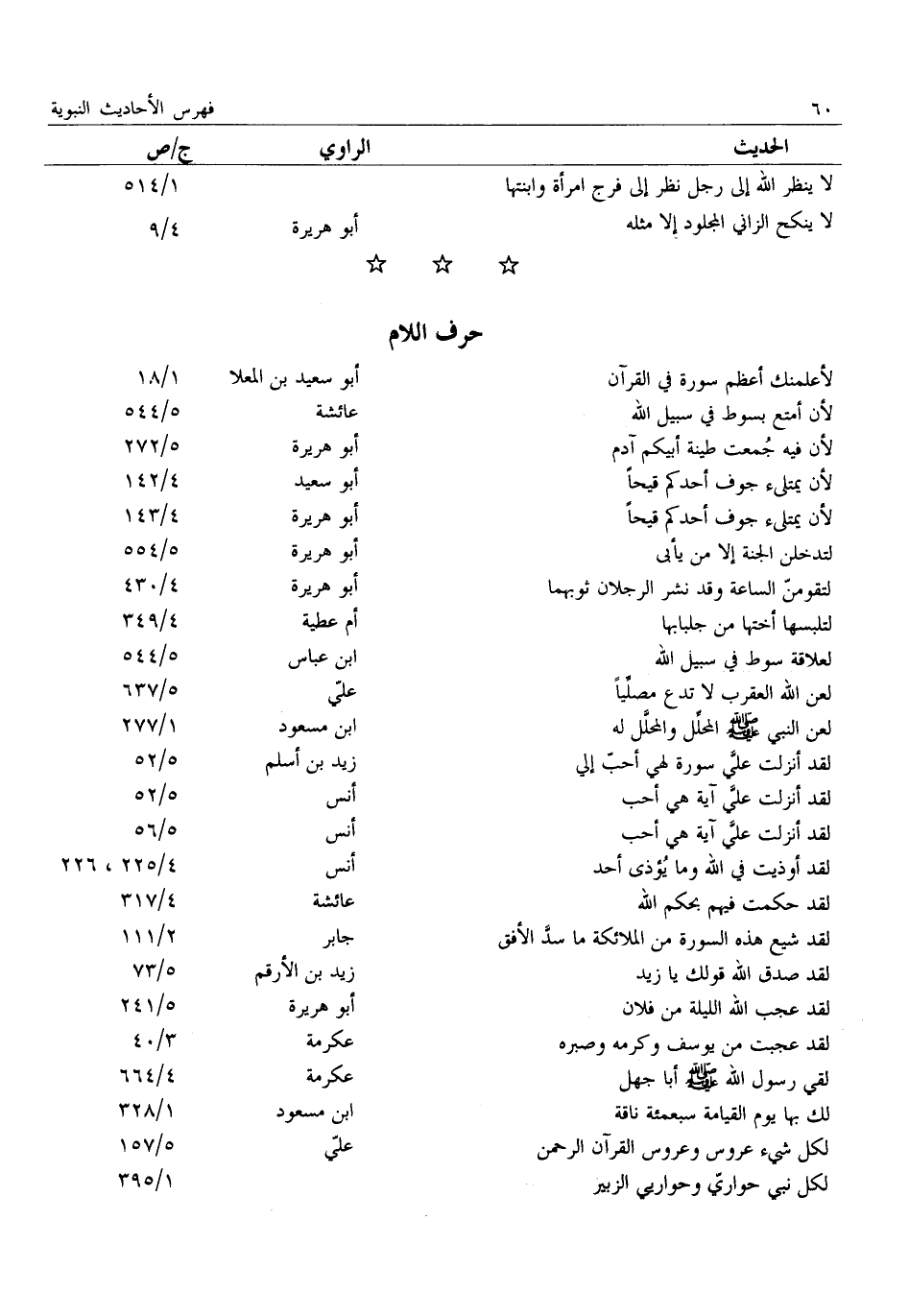 لأعلمنك أعظم سورة في القرآن: أبو سعيد بن المعلا: 1/ 18 لأن أمتع بسوط في سبيل الله: عائشة: 5/ 544 لأن فيه جمعت طينة أبيكم آدم: أبو هريرة: 5/ 272 لأن يمتلئ جوف أحدكم قيحا: أبو سعيد: 4/ 142 لأن يمتلئ جوف أحدكم قيحا: أبو هريرة: 4/ 143 لتدخلن الجنة إلا من يأبى: أبو هريرة: 5/ 554 لتقومنّ الساعة وقد نشر الرجلان ثوبهما: أبو هريرة: 4/ 430 لتلبسها أختها من جلبابها: أم عطية: 4/ 349 لعلاقة سوط في سبيل الله: ابن عباس: 5/ 544 لعن الله العقرب لا تدع مصلّيا: عليّ: 5/ 637 لعن النبي صلّى الله عليه وسلم المحلّل والمحلّل له: ابن مسعود: 1/ 277 لَقَدْ أُنْزِلَتْ عَلَيَّ سُورَةٌ لَهِيَ أَحَبُّ إِلَيَّ: زيد بن أسلم: 5/ 52 لقد أنزلت عليّ آية هي أحب: أنس: 5/ 52 لقد أنزلت عليّ آية هي أحب: أنس: 5/ 56 لَقَدْ أُوذِيتُ فِي اللَّهِ وَمَا يُؤْذَى أَحَدٌ: أنس: 4/ 225، 226 لقد حكمت فيهم بحكم الله: عائشة: 4/ 317 لَقَدْ شَيَّعَ هَذِهِ السُّورَةَ مِنَ الْمَلَائِكَةِ مَا سدّ الأفق: جابر: 2/ 111 لقد صدق الله قولك يا زيد: زيد بن الأرقم: 5/ 73 لقد عجب الله الليلة من فلان: أبو هريرة: 5/ 241 لقد عجبت من يوسف وكرمه وصبره: عكرمة: 3/ 40 لقي رسول الله صلّى الله عليه وسلم أبا جهل: عكرمة: 4/ 664 لك بها يوم القيامة سبعمائة ناقة: ابن مسعود: 1/ 328 لكل شيء عروس وعروس القرآن الرحمن: عليّ: 5/ 157 لكل نبي حواريّ وحواريي الزبير: 1/ 395