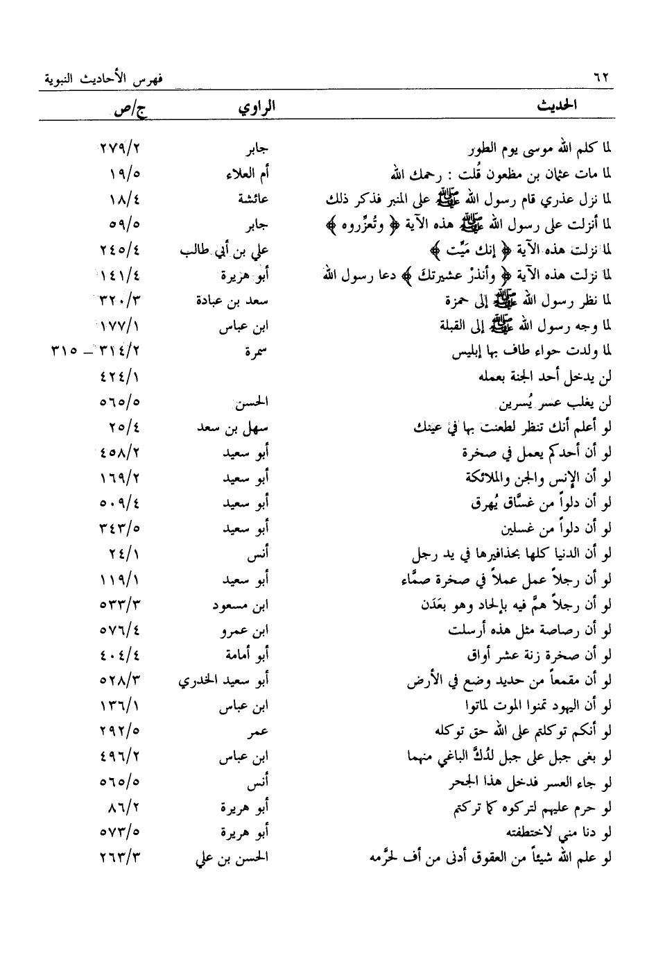 لما كلم الله موسى يوم الطور: جابر: 2/ 279 لَمَّا مَاتَ عُثْمَانُ بْنُ مَظْعُونٍ قُلْتُ: رَحِمَكَ الله: أم العلاء: 5/ 19 لَمَا نَزَلَ عُذْرِي قَامَ رَسُولَ اللَّهِ صَلَّى اللَّهُ عَلَيْهِ وَسَلَّمَ عَلَى المنبر فذكر ذلك: عائشة: 4/ 18 لَمَّا أُنْزِلَتْ عَلَى رَسُولِ اللَّهِ صَلَّى اللَّهُ عَلَيْهِ وَسَلَّمَ هذه الآية وتعزّروه: جابر: 5/ 59 لما نزلت هذه الآية إنك ميّت: علي بن أبي طالب: 4/ 245 لما نزلت هذه الآية وأنذر عشيرتك دعا رسول الله: أبو هريرة: 4/ 141 لَمَّا نَظَرَ رَسُولُ اللَّهِ صَلَّى اللَّهُ عَلَيْهِ وَسَلَّمَ إلى حمزة: سعد بن عبادة: 3/ 320 لَمَّا وُجِّهَ رَسُولُ اللَّهِ صَلَّى اللَّهُ عَلَيْهِ وَسَلَّمَ إِلَى القبلة: ابن عباس: 1/ 177 لما ولدت حواء طاف بها إبليس: سمرة: 2/ 314- 315 لن يدخل أحد الجنة بعمله:: 1/ 424 لن يغلب عسر يسرين: الحسن: 5/ 565 لَوْ أَعْلَمُ أَنَّكَ تَنْظُرُ لَطَعَنْتُ بِهَا فِي عينك: سهل بن سعد: 4/ 25 لو أن أحدكم يعمل في صخرة: أبو سعيد: 2/ 458 لو أن الإنس والجن والملائكة: أبو سعيد: 2/ 169 لو أن دلوا من غسّاق يهرق: أبو سعيد: 4/ 509 لو أن دلوا من غسلين: أبو سعيد: 5/ 343 لَوْ أَنَّ الدُّنْيَا كُلَّهَا بِحَذَافِيرِهَا فِي يَدِ رجل: أنس: 1/ 24 لَوْ أَنَّ رَجُلًا عَمِلَ عَمَلًا فِي صَخْرَةٍ صمّاء: أبو سعيد: 1/ 119 لَوْ أَنَّ رَجُلًا هَمَّ فِيهِ بِإِلْحَادٍ وَهُوَ بعدن: ابن مسعود: 3/ 533 لو أن رصاصة مثل هذه أرسلت: ابن عمرو: 4/ 576 لو