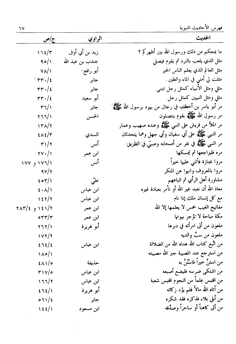 مَا يَمْنَعُكُمْ مِنْ ذَلِكَ وَرَسُولُ اللَّهِ بَيْنَ أظهركم؟: زيد بن أبي أوفى: 3/ 164 مَثَلُ الَّذِي يَلْعَبُ بِالنَّرْدِ ثُمَّ يَقُومُ فَيُصَلِّي: جندب بن عبد الله: 1/ 95 مثل العالم الذي يعلم الناس الخير: أبو رافع: 1/ 78 مثلت لي أمتي في الماء والطين: جابر: 4/ 330 مثلي ومثل الأنبياء كمثل رجل ابتنى: جابر: 4/ 330 مثلي ومثل النبيين كمثل رجل: أبو سعيد: 4/ 330 مَرَّ أَبُو يَاسِرِ بْنُ أَخْطَبَ فِي رِجَالٍ مِنْ يَهُودَ بِرَسُولِ اللَّهِ صَلَّى اللَّهُ عَلَيْهِ وسلم: جابر: 1/ 36 مر رسول الله صلّى الله عليه وسلم بقوم ينتصلون: الحسن: 1/ 266 مَرَّ الْمَلَأُ مِنْ قُرَيْشٍ عَلَى النَّبِيِّ صَلَّى الله عليه وسلم وعنده صهيب وعمار:: 2/ 138 مر النبي صلّى الله عليه وسلم على أبي سفيان وأبي جهل وهما يتحدثان: السدي: 3/ 484 مر النبي صَلَّى اللَّهُ عَلَيْهِ وَسَلَّمَ فِي نَفَرٍ مِنْ أَصْحَابِهِ وَصَبِيٍّ فِي الطريق: أنس: 2/ 31 مره فليراجعها ثم ليمسكها: ابن عمر: 1/ 270 مروا بجنازة فأثني عليها خيرا: أنس: 1/ 176 و 177 مروا بالمعروف وانهوا عن المنكر:: 2/ 97 مشاورة أهل الرأي ثم اتباعهم: عليّ: 1/ 453 مَعَاذَ اللَّهِ أَنْ نَعْبُدَ غَيْرَ اللَّهِ أَوْ نأمر بعبادة غيره: ابن عباس: 1/ 408 مع كل إنسان ملك إذا نام: ابن عباس: 2/ 142 مَفَاتِيحُ الْغَيْبِ خَمْسٌ لَا يَعْلَمُهَا إِلَّا اللَّهُ: ابن عمر: 2/ 141 و 4/ 283 مكة مباحة لا تؤجر بيوتها: ابن عمر: 3/ 533 ملعون من أتى امرأته في دبرها: أبو هريرة: 1/ 262 ملعون من سبّ والديه:: 2/ 172 مَنِ اتَّبَعَ كِتَابَ اللَّهِ هَدَاهُ اللَّهُ مِنَ الضلالة: ابن عباس: 4/ 464 مَنِ اسْتَرْجَعَ عِنْدَ الْمُصِيبَةِ جَبَرَ اللَّهُ مُصِيبَتَهُ:: 1/ 185 من استنّ خيرا فاستنّ به: حذيفة: 5/ 481 من اشتكى ضرسه فليضع إصبعه: ابن عباس: 5/ 317 مَنِ اقْتَبَسَ عِلْمًا مِنَ النُّجُومِ اقْتَبَسَ شُعْبَةً: ابن عباس: 2/ 166 مَنْ آتَاهُ اللَّهُ مَالًا فَلَمْ يُؤَدِّ زَكَاتَهُ: أبو هريرة: 1/ 464 من أبلى بلاء فذكره فقد شكره: جابر: 4/ 561 من أتى كاهنا أو ساحرا وصدّقه: ابن مسعود: 1/ 144