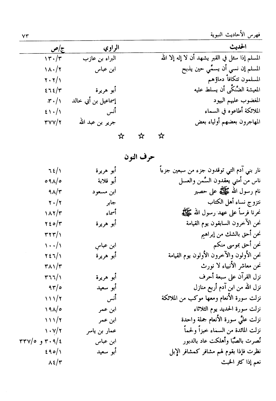 نَارُ بَنِي آدَمَ الَّتِي تُوقِدُونَ جُزْءٌ مِنْ سبعين جزءا: أبو هريرة: 1/ 64 ناس من أمتي يعقدون السّمن والعسل: أبو قلابة: 5/ 598 نام رَسُولَ اللَّهِ صَلَّى اللَّهُ عَلَيْهِ وَسَلَّمَ عَلَى حصير: ابن مسعود: 3/ 98 نتزوج نساء أهل الكتاب: جابر: 2/ 20 نَحَرْنَا فَرَسًا عَلَى عَهْدِ رَسُولِ اللَّهِ صَلَّى اللَّهُ عَلَيْهِ وسلم: أسماء: 3/ 182 نحن الآخرون السابقون يوم القيامة: أبو هريرة: 3/ 245 نحن أحق بالشك من إبراهيم:: 1/ 323 نحن أحق بموسى منكم: ابن عباس: 1/ 100 نحن الأولون والآخرون الأولون يوم القيامة: أبو هريرة: 1/ 246 نحن معاشر الأنبياء لا نورث:: 3/ 381 نزل القرآن على سبعة أحرف: أبو هريرة: 1/ 366 نَزَلَ اللَّهُ مِنِ ابْنِ آدَمَ أَرْبَعَ مَنَازِلَ: أبو سعيد: 5/ 93 نَزَلَتْ سُورَةُ الْأَنْعَامِ وَمَعَهَا مَوْكِبٌ مِنَ الْمَلَائِكَةِ: أنس: 2/ 111 نزلت سورة الحديد يوم الثلاثاء: ابن عمر: 5/ 198 نزلت عليّ سورة الأنعام جملة واحدة: ابن عمر: 2/ 111 نزلت المائدة من السماء خبزا ولحما: عمار بن ياسر: 2/ 107 نصرت بالصّبا وأهلكت عاد بالدبور: ابن عباس: 4/ 309 و 5/ 337 نَظَرْتُ فَإِذَا بِقَوْمٍ لَهُمْ مَشَافِرُ كَمَشَافِرِ الْإِبِلِ: أبو سعيد: 1/ 495 نعم إذا كثر الخبث: 3/ 84
